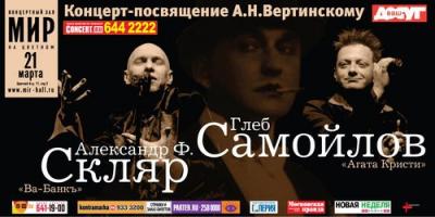Это интересно: На почве любви к наследию Александра Вертинского Глеб Самойлов («Агата Кристи») и Александр Ф. Скляр («Ва-Банкъ»), по идее, должны были сойтись уж давно. Ещё в начале 90-х Самойлов творил безысходные, но изысканно красивые сюжетные романсы («Декаданс», «Мотоциклетка») по модели «странных песенок» Вертинского – где трагичность подачи сочеталась с тончайшей издёвкой над непроходимой... продолжение