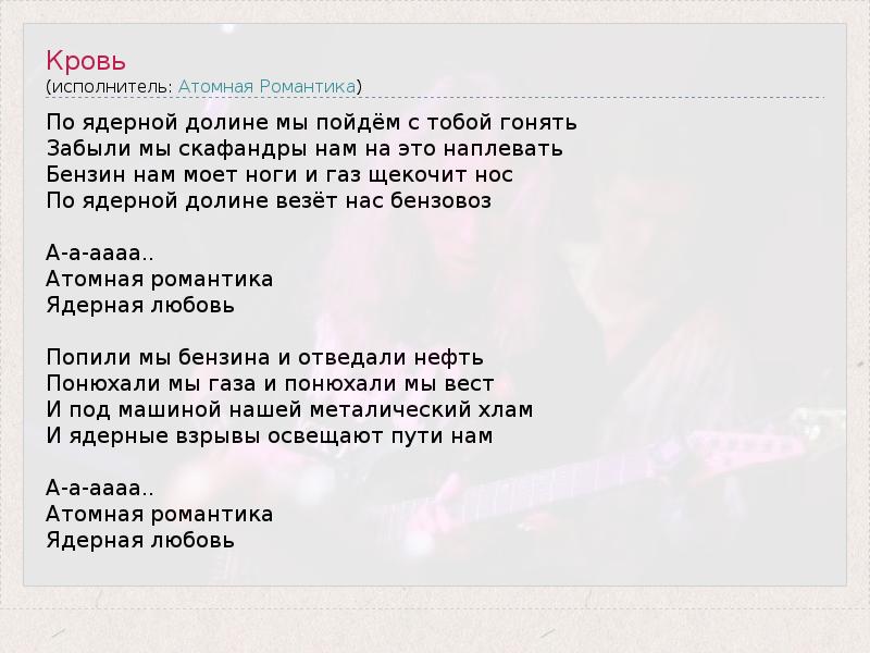По ядерной долине мы пойдём с тобой гонять Забыли мы скафандры нам на это наплевать Бензин нам моет ноги и газ щекочит нос По ядерной долине везёт нас бензовоз А-а-аааа.. Атомная романтика Ядерная любовь Попили мы бензина и отведали нефть Понюхали мы газа и понюхали мы вест И под машиной нашей металический хлам И ядерные взрывы освещают пути нам А-а-аааа.. Атомная романтика Ядерная любовь