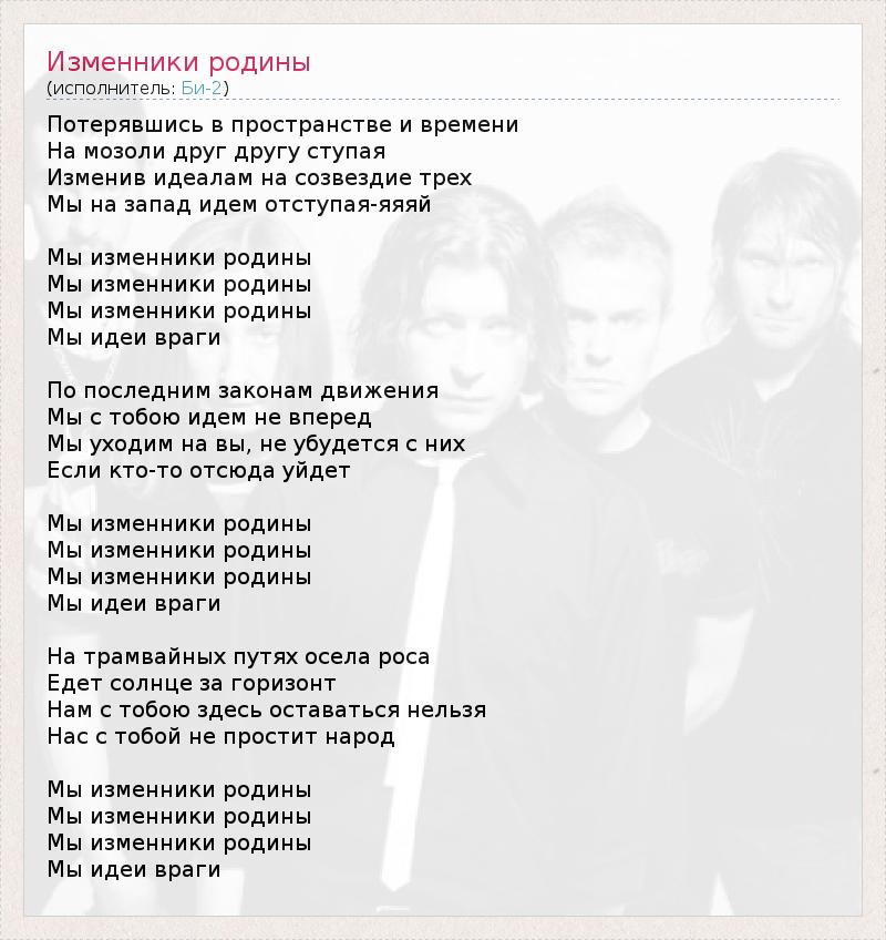 Потерявшись в пространстве и времени На мозоли друг другу ступая Изменив идеалам на созвездие трех Мы на запад идем отступая-яяяй Мы изменники родины Мы изменники родины Мы изменники родины Мы идеи враги По последним законам движения Мы с тобою идем не вперед Мы уходим на вы, не убудется с них Если кто-то отсюда уйдет Мы изменники родины Мы изменники родины Мы изменники родины Мы идеи враги На трамвайных путях осела роса Едет солнце за горизонт Нам с тобою здесь оставаться нельзя Нас с тобой не простит народ Мы изменники родины Мы изменники родины Мы изменники родины Мы идеи враги