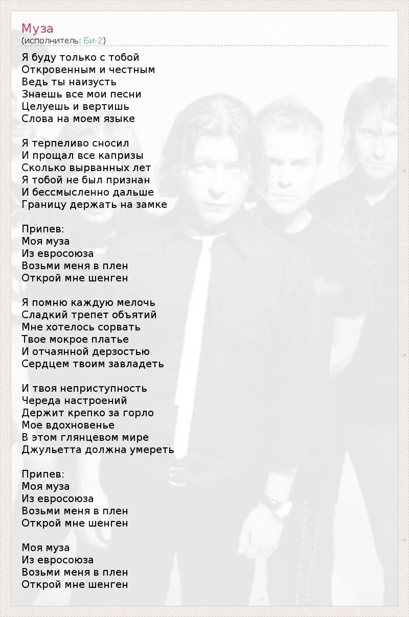 Впервые "Муза", как идея песни, посетила Би-2 в апреле 2008 года - а уже через пару дней композиция была представлена жителям Мюнхена, и в последствии стала главной фишкой весеннего тура Би-2 по Германии. Группа решила включить эту песню в программу даже несмотря на то, что на тот момент к ней был написан только один куплет. Леве пришлось выкручиваться, повторяя свой старый трюк с "Дурочкой" - пока не было всего текста, на концертах он просто пел первый куплет по два раза. Но даже без слов было ясно, что эта песня станет одной из ключевых на новом альбоме.