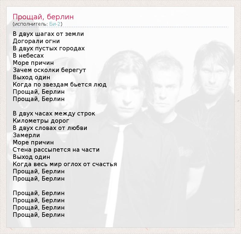 В двух шагах от земли Догорали огни В двух пустых городах В небесах Море причин Зачем осколки берегут Выход один Когда по звездам бьется люд Прощай, Берлин Прощай, Берлин В двух часах между строк Километры дорог В двух словах от любви Замерли Море причин Стена рассыпется на части Выход один Когда весь мир оглох от счастья Прощай, Берлин Прощай, Берлин Прощай, Берлин Прощай, Берлин Прощай, Берлин Прощай, Берлин