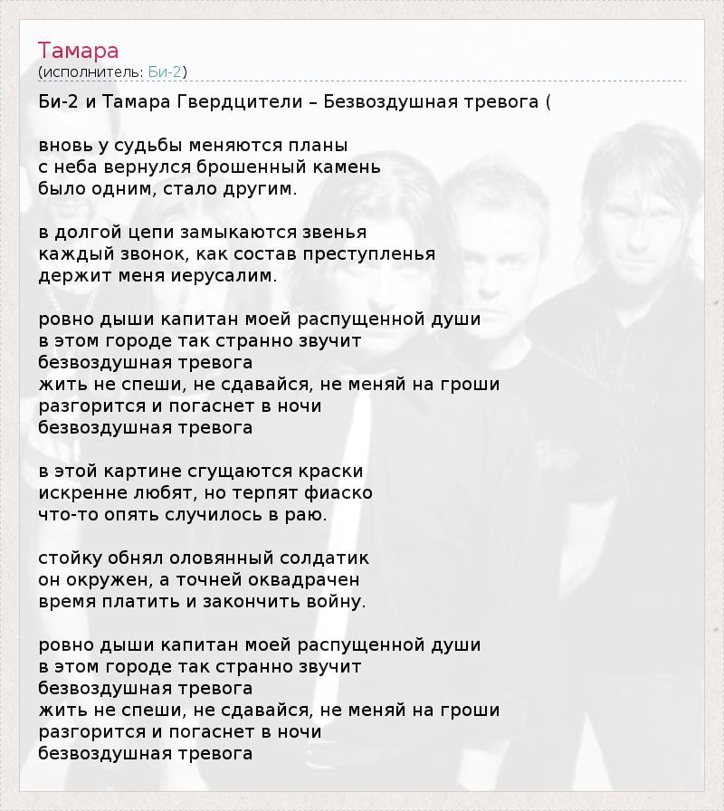 Би-2 и Тамара Гвердцители – Безвоздушная тревога ( вновь у судьбы меняются планы с неба вернулся брошенный камень было одним, стало другим. в долгой цепи замыкаются звенья каждый звонок, как состав преступленья держит меня иерусалим. ровно дыши капитан моей распущенной души в этом городе так странно звучит безвоздушная тревога жить не спеши, не сдавайся, не меняй на гроши разгорится и погаснет в ночи безвоздушная тревога в этой картине сгущаются краски искренне любят, но терпят фиаско что-то опять случилось в раю. стойку обнял оловянный солдатик он окружен, а точней оквадрачен время платить и закончить войну. ровно дыши капитан моей распущенной души в этом городе так странно звучит безвоздушная тревога жить не спеши, не сдавайся, не меняй на гроши разгорится и погаснет в ночи безвоздушная тревога