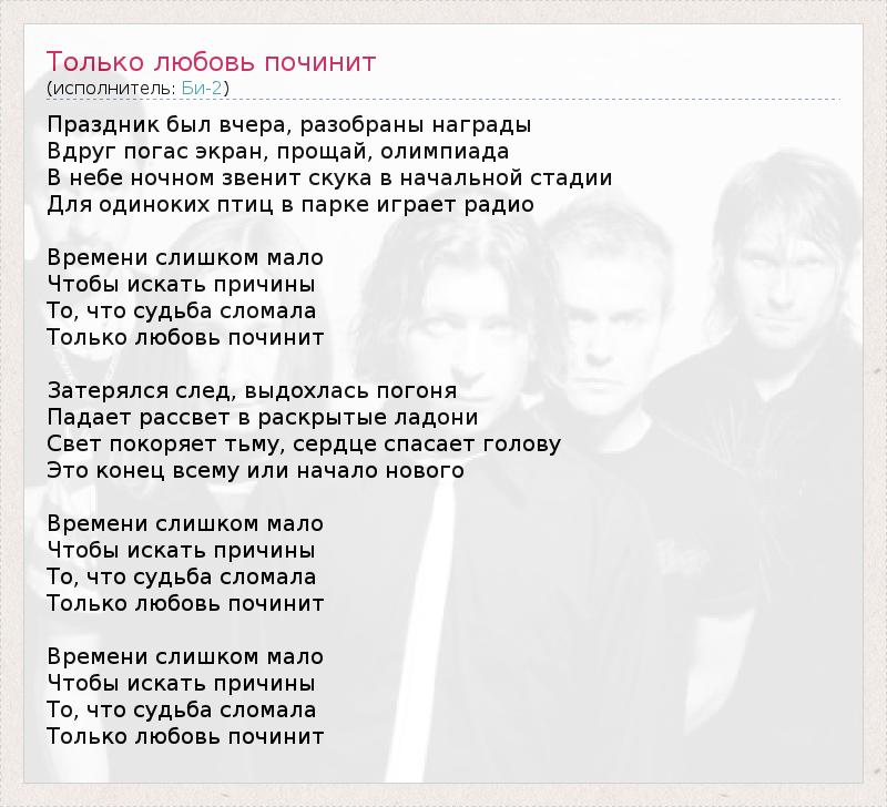 Праздник был вчера, разобраны награды Вдруг погас экран, прощай, олимпиада В небе ночном звенит скука в начальной стадии Для одиноких птиц в парке играет радио Времени слишком мало Чтобы искать причины То, что судьба сломала Только любовь починит Затерялся след, выдохлась погоня Падает рассвет в раскрытые ладони Свет покоряет тьму, сердце спасает голову Это конец всему или начало нового Времени слишком мало Чтобы искать причины То, что судьба сломала Только любовь починит Времени слишком мало Чтобы искать причины То, что судьба сломала Только любовь починит