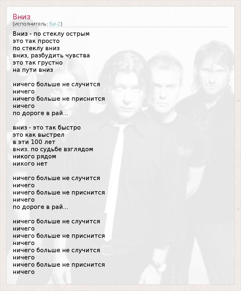 Вниз - по стеклу острым это так просто по стеклу вниз вниз, разбудить чувства это так грустно на пути вниз ничего больше не случится ничего ничего больше не приснится ничего по дороге в рай... вниз - это так быстро это как выстрел в эти 100 лет вниз. по судьбе взглядом никого рядом никого нет ничего больше не случится ничего ничего больше не приснится ничего по дороге в рай... ничего больше не случится ничего ничего больше не приснится ничего ничего больше не случится ничего ничего больше не приснится ничего