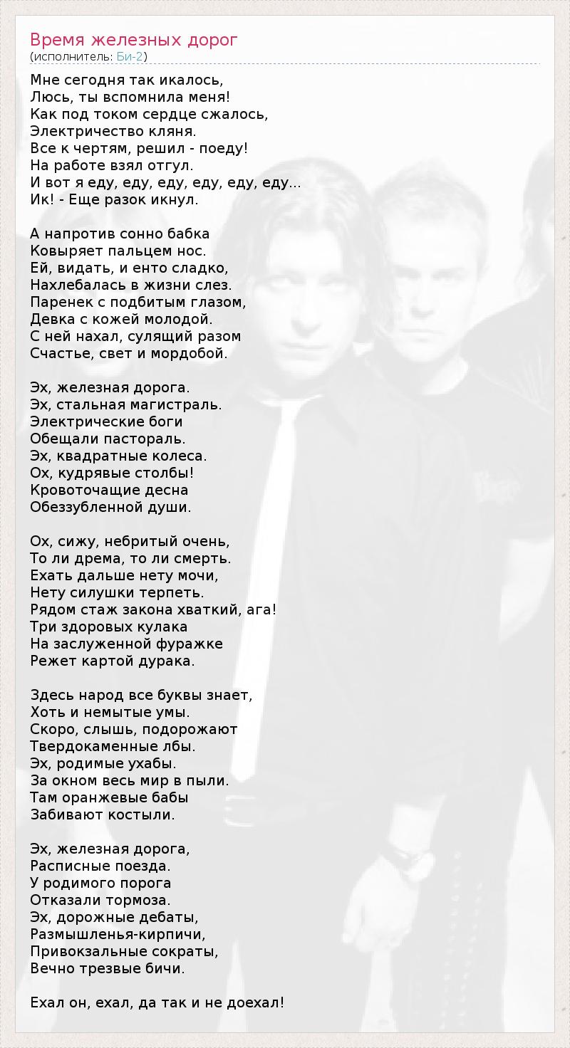 Мне сегодня так икалось, Люсь, ты вспомнила меня! Как под током сердце сжалось, Электричество кляня. Все к чертям, решил - поеду! На работе взял отгул. И вот я еду, еду, еду, еду, еду, еду... Ик! - Еще разок икнул. А напротив сонно бабка Ковыряет пальцем нос. Ей, видать, и енто сладко, Нахлебалась в жизни слез. Паренек с подбитым глазом, Девка с кожей молодой. С ней нахал, сулящий разом Счастье, свет и мордобой. Эх, железная дорога. Эх, стальная магистраль. Электрические боги Обещали пастораль. Эх, квадратные колеса. Ох, кудрявые столбы! Кровоточащие десна Обеззубленной души. Ох, сижу, небритый очень, То ли дрема, то ли смерть. Ехать дальше нету мочи, Нету силушки терпеть. Рядом стаж закона хваткий, ага! Три здоровых кулака На заслуженной фуражке Режет картой дурака. Здесь народ все буквы знает, Хоть и немытые умы. Скоро, слышь, подорожают Твердокаменные лбы. Эх, родимые ухабы. За окном весь мир в пыли. Там оранжевые бабы Забивают костыли. Эх, железная дорога, Расписные поезда. У родимого порога Отказали тормоза. Эх, дорожные дебаты, Размышленья-кирпичи, Привокзальные сократы, Вечно трезвые бичи. Ехал он, ехал, да так и не доехал!