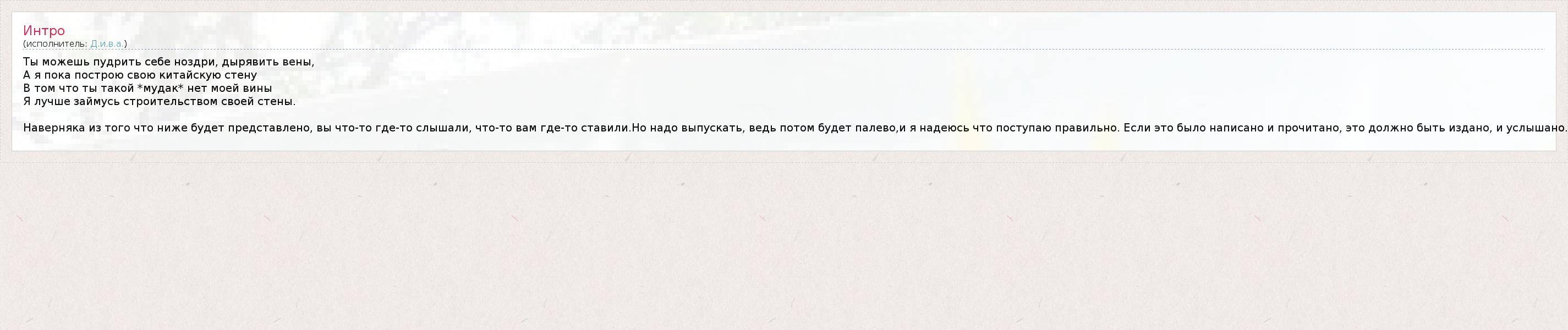 Ты можешь пудрить себе ноздри, дырявить вены, А я пока построю свою китайскую стену В том что ты такой *мудак* нет моей вины Я лучше займусь строительством своей стены. Наверняка из того что ниже будет представлено, вы что-то где-то слышали, что-то вам где-то ставили.Но надо выпускать, ведь потом будет палево,и я надеюсь что поступаю правильно. Если это было написано и прочитано, это должно быть издано, и услышано.