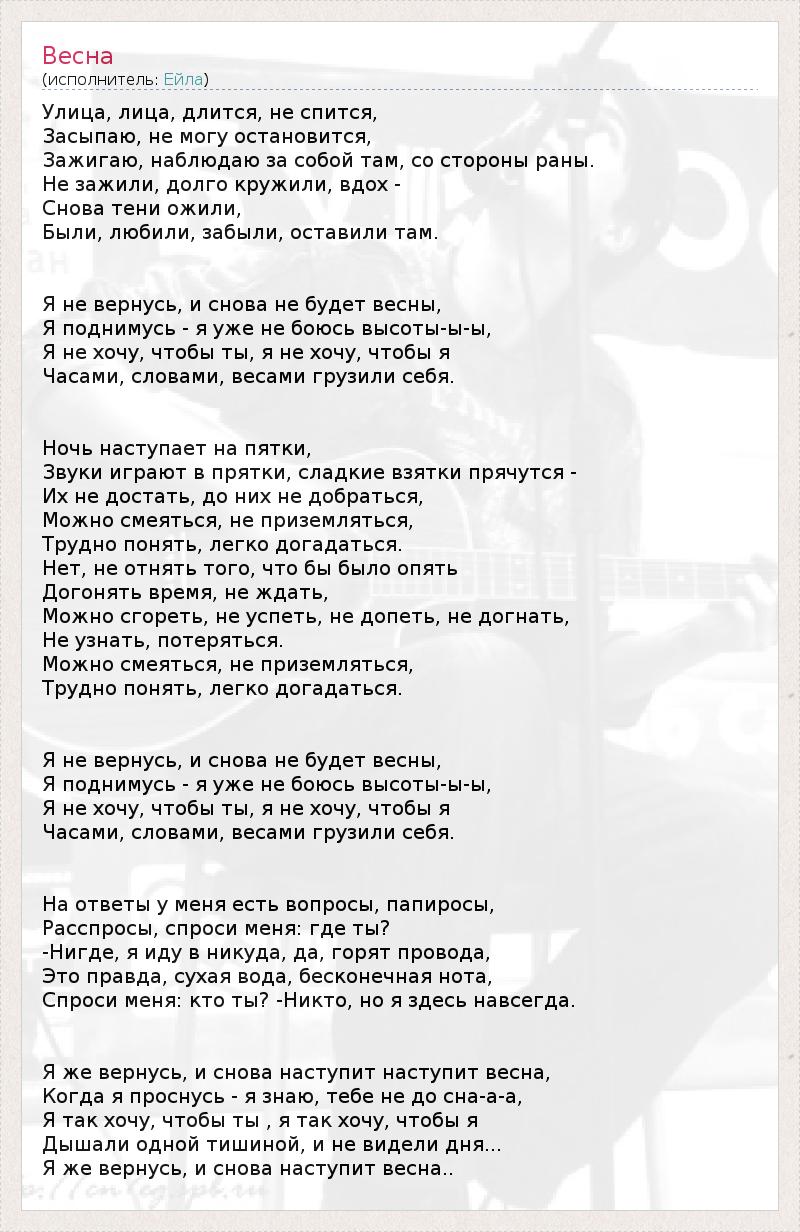 Улица, лица, длится, не спится, Засыпаю, не могу остановится, Зажигаю, наблюдаю за собой там, со стороны раны. Не зажили, долго кружили, вдох - Снова тени ожили, Были, любили, забыли, оставили там. Я не вернусь, и снова не будет весны, Я поднимусь - я уже не боюсь высоты-ы-ы, Я не хочу, чтобы ты, я не хочу, чтобы я Часами, словами, весами грузили себя. Ночь наступает на пятки, Звуки играют в прятки, сладкие взятки прячутся - Их не достать, до них не добраться, Можно смеяться, не приземляться, Трудно понять, легко догадаться. Нет, не отнять того, что бы было опять Догонять время, не ждать, Можно сгореть, не успеть, не допеть, не догнать, Не узнать, потеряться. Можно смеяться, не приземляться, Трудно понять, легко догадаться. Я не вернусь, и снова не будет весны, Я поднимусь - я уже не боюсь высоты-ы-ы, Я не хочу, чтобы ты, я не хочу, чтобы я Часами, словами, весами грузили себя. На ответы у меня есть вопросы, папиросы, Расспросы, спроси меня: где ты? -Нигде, я иду в никуда, да, горят провода, Это правда, сухая вода, бесконечная нота, Спроси меня: кто ты? -Никто, но я здесь навсегда. Я же вернусь, и снова наступит наступит весна, Когда я проснусь - я знаю, тебе не до сна-а-а, Я так хочу, чтобы ты , я так хочу, чтобы я Дышали одной тишиной, и не видели дня... Я же вернусь, и снова наступит весна..