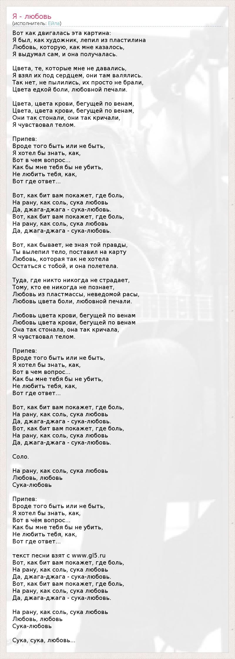Вот как двигалась эта картина: Я был, как художник, лепил из пластилина Любовь, которую, как мне казалось, Я выдумал сам, и она получалась. Цвета, те, которые мне не давались, Я взял их под сердцем, они там валялись. Так нет, не пылились, их просто не брали, Цвета едкой боли, любовной печали. Цвета, цвета крови, бегущей по венам, Цвета, цвета крови, бегущей по венам, Они так стонали, они так кричали, Я чувствовал телом. Припев: Вроде того быть или не быть, Я хотел бы знать, как, Вот в чем вопрос... Как бы мне тебя бы не убить, Не любить тебя, как, Вот где ответ... Вот, как бит вам покажет, где боль, На рану, как соль, сука любовь Да, джага-джага - сука-любовь. Вот, как бит вам покажет, где боль, На рану, как соль, сука любовь Да, джага-джага - сука-любовь. Вот, как бывает, не зная той правды, Ты вылепил тело, поставил на карту Любовь, которая так не хотела Остаться с тобой, и она полетела. Туда, где никто никогда не страдает, Тому, кто ее никогда не познает, Любовь из пластмассы, неведомой расы, Любовь цвета боли, любовной печали. Любовь цвета крови, бегущей по венам Любовь цвета крови, бегущей по венам Она так стонала, она так кричала, Я чувствовал телом. Припев: Вроде того быть или не быть, Я хотел бы знать, как, Вот в чем вопрос... Как бы мне тебя бы не убить, Не любить тебя, как, Вот где ответ... Вот, как бит вам покажет, где боль, На рану, как соль, сука любовь Да, джага-джага - сука-любовь. Вот, как бит вам покажет, где боль, На рану, как соль, сука любовь Да, джага-джага - сука-любовь. Соло. На рану, как соль, сука любовь Любовь, любовь Сука-любовь Припев: Вроде того быть или не быть, Я хотел бы знать, как, Вот в чём вопрос... Как бы мне тебя бы не убить, Не любить тебя, как, Вот где ответ... текст песни взят с www.gl5.ru Вот, как бит вам покажет, где боль, На рану, как соль, сука любовь Да, джага-джага - сука-любовь. Вот, как бит вам покажет, где боль, На рану, как соль, сука любовь Да, джага-джага - сука-любовь. На рану, как соль, сука любовь Любовь, любовь Сука-любовь Сука, сука, любовь...