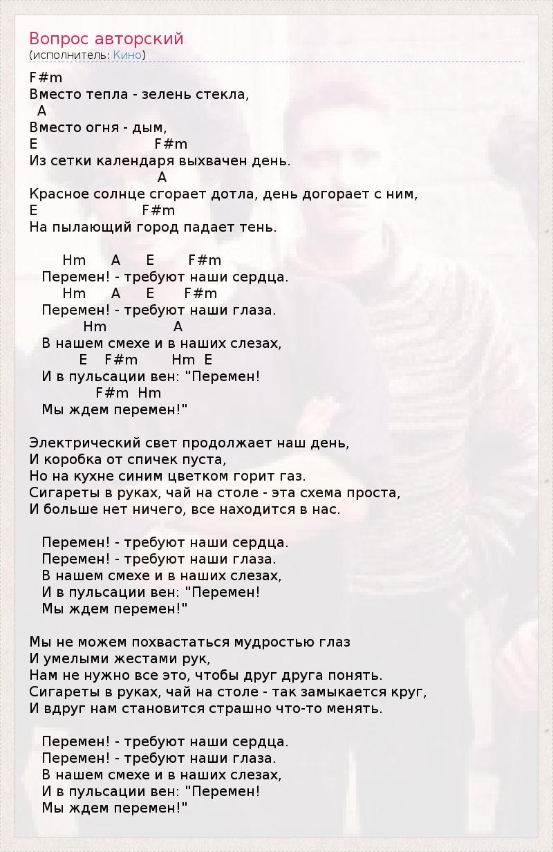 Это интересно:«Кино» — одна из популярнейших советских рок-групп 1980-х годов, лидером которой был Виктор Цой.Виктор Цой родился 21 июня 1962 года в Ленинграде, в семье преподавателя физкультуры Валентины Васильевны Цой и инженера Роберта Максимовича Цоя.Коллектив образовался летом 1981 года в Ленинграде и первоначально назывался «Гарин и гиперболоиды». В него входили Виктор Цой, Алексей «Рыба»... продолжение