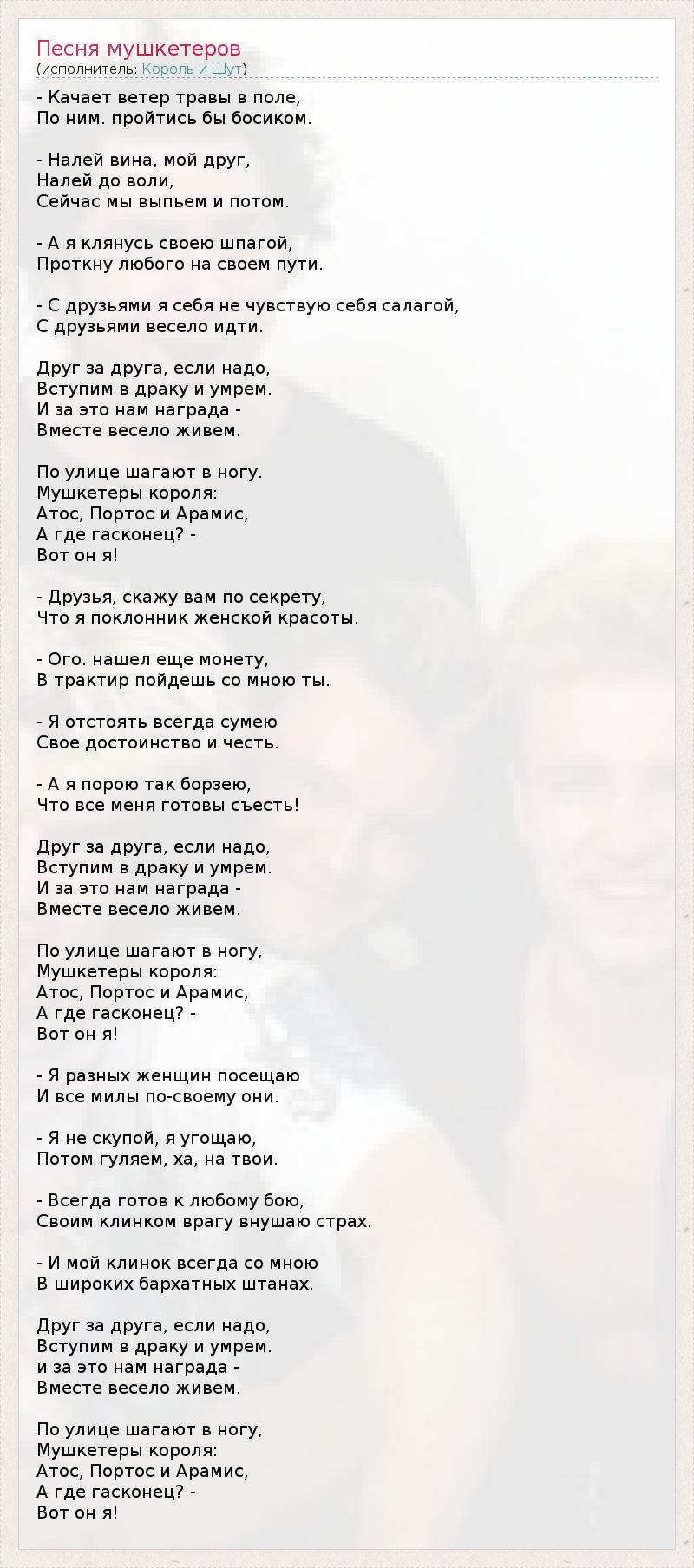ГлавнаяИсполнителиКороль и ШутПесня мушкетеров
