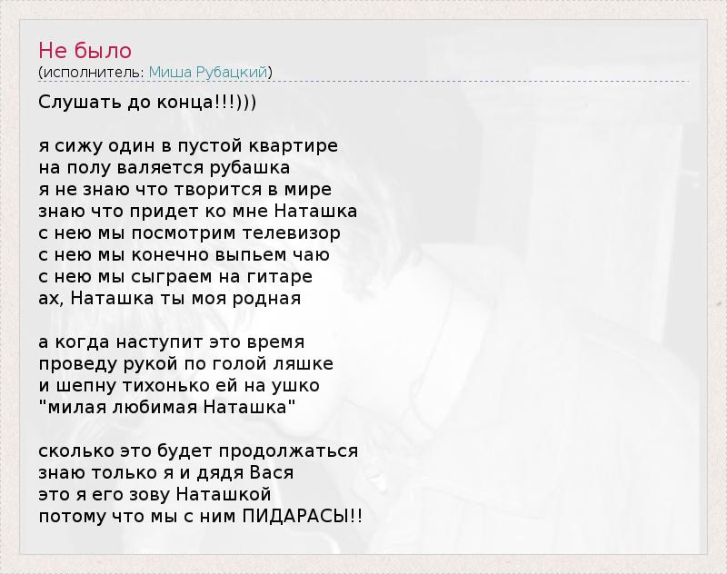 Слушать до конца!!!))) я сижу один в пустой квартире на полу валяется рубашка я не знаю что творится в мире знаю что придет ко мне Наташка с нею мы посмотрим телевизор с нею мы конечно выпьем чаю с нею мы сыграем на гитаре ах, Наташка ты моя родная а когда наступит это время проведу рукой по голой ляшке и шепну тихонько ей на ушко "милая любимая Наташка" сколько это будет продолжаться знаю только я и дядя Вася это я его зову Наташкой потому что мы с ним ПИДАРАСЫ!!