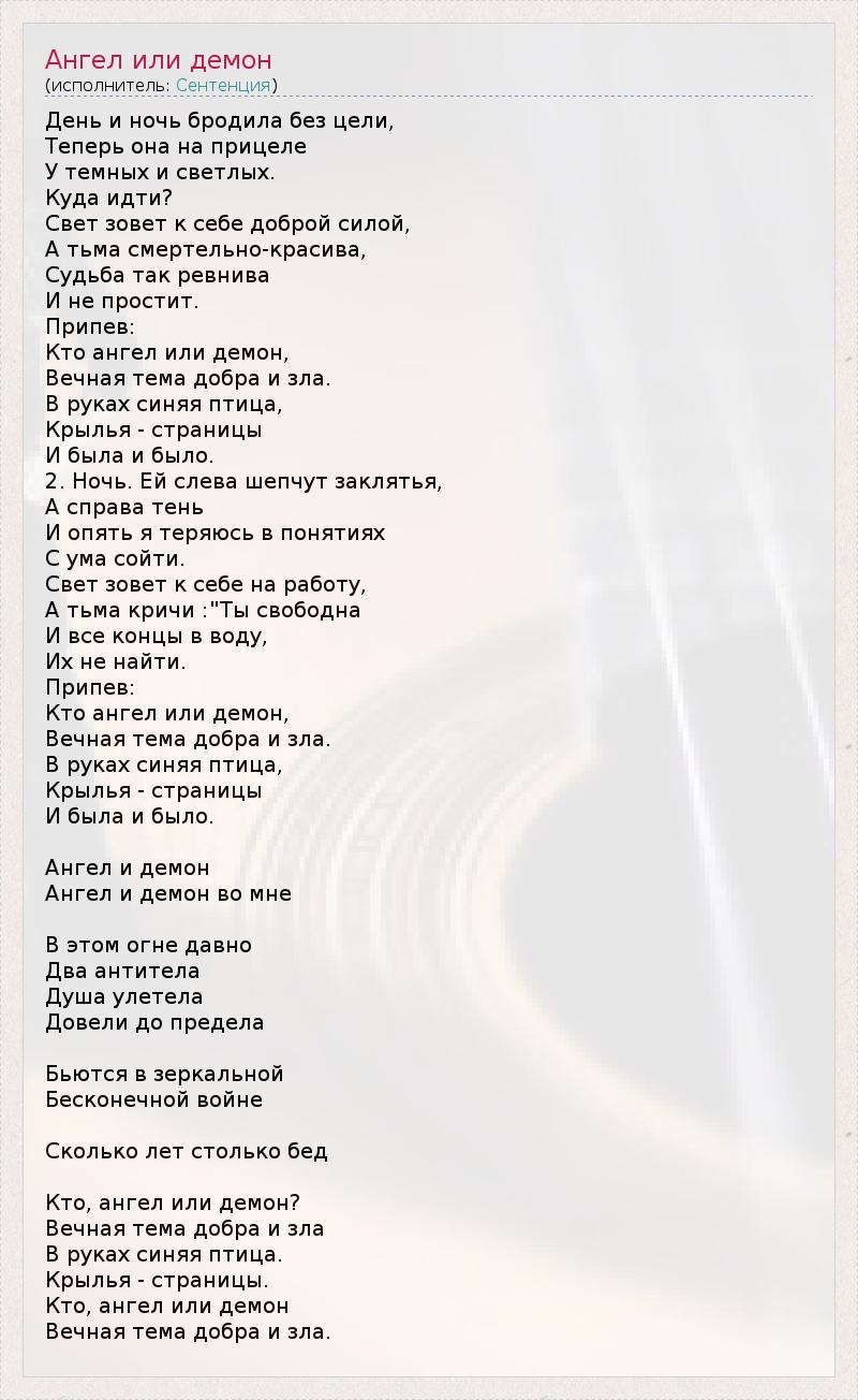 День и ночь бродила без цели, Теперь она на прицеле У темных и светлых. Куда идти? Свет зовет к себе доброй силой, А тьма смертельно-красива, Судьба так ревнива И не простит. Припев: Кто ангел или демон, Вечная тема добра и зла. В руках синяя птица, Крылья - страницы И была и было. 2. Ночь. Ей слева шепчут заклятья, А справа тень И опять я теряюсь в понятиях С ума сойти. Свет зовет к себе на работу, А тьма кричи :"Ты свободна И все концы в воду, Их не найти. Припев: Кто ангел или демон, Вечная тема добра и зла. В руках синяя птица, Крылья - страницы И была и было. Ангел и демон Ангел и демон во мне В этом огне давно Два антитела Душа улетела Довели до предела Бьются в зеркальной Бесконечной войне Сколько лет столько бед Кто, ангел или демон? Вечная тема добра и зла В руках синяя птица. Крылья - страницы. Кто, ангел или демон Вечная тема добра и зла.