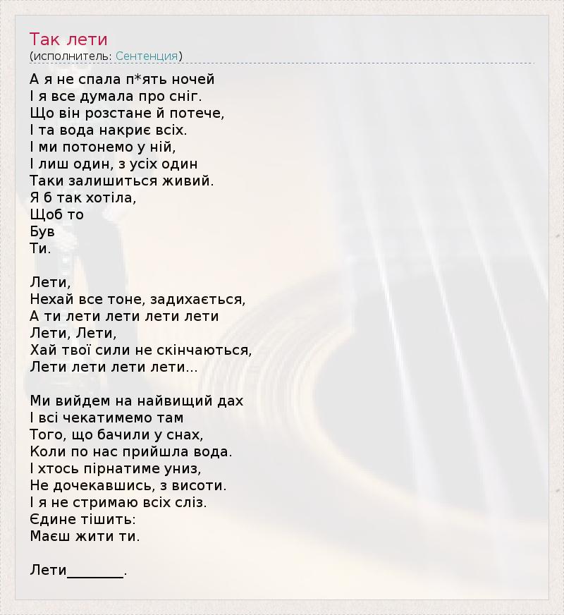 А я не спала п*ять ночей І я все думала про сніг. Що він розстане й потече, І та вода накриє всіх. І ми потонемо у ній, І лиш один, з усіх один Таки залишиться живий. Я б так хотіла, Щоб то Був Ти. Лети, Нехай все тоне, задихається, А ти лети лети лети лети Лети, Лети, Хай твої сили не скінчаються, Лети лети лети лети... Ми вийдем на найвищий дах І всі чекатимемо там Того, що бачили у снах, Коли по нас прийшла вода. І хтось пірнатиме униз, Не дочекавшись, з висоти. І я не стримаю всіх сліз. Єдине тішить: Маєш жити ти. Лети________.