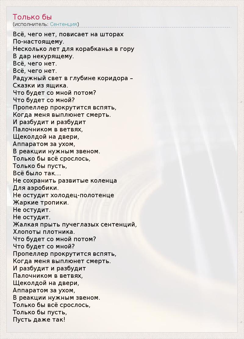 Всё, чего нет, повисает на шторах По-настоящему. Несколько лет для корабканья в гору В дар некурящему. Всё, чего нет. Всё, чего нет. Радужный свет в глубине коридора – Сказки из ящика. Что будет со мной потом? Что будет со мной? Пропеллер прокрутится вспять, Когда меня выплюнет смерть. И разбудит и разбудит Палочником в ветвях, Щеколдой на двери, Аппаратом за ухом, В реакции нужным звеном. Только бы всё срослось, Только бы пусть, Всё было так… Не сохранить развитые коленца Для аэробики. Не остудит холодец-полотенце Жаркие тропики. Не остудит. Не остудит. Жалкая прыть пучеглазых сентенций, Хлопоты плотника. Что будет со мной потом? Что будет со мной? Пропеллер прокрутится вспять, Когда меня выплюнет смерть. И разбудит и разбудит Палочником в ветвях, Щеколдой на двери, Аппаратом за ухом, В реакции нужным звеном. Только бы всё срослось, Только бы пусть, Пусть даже так!