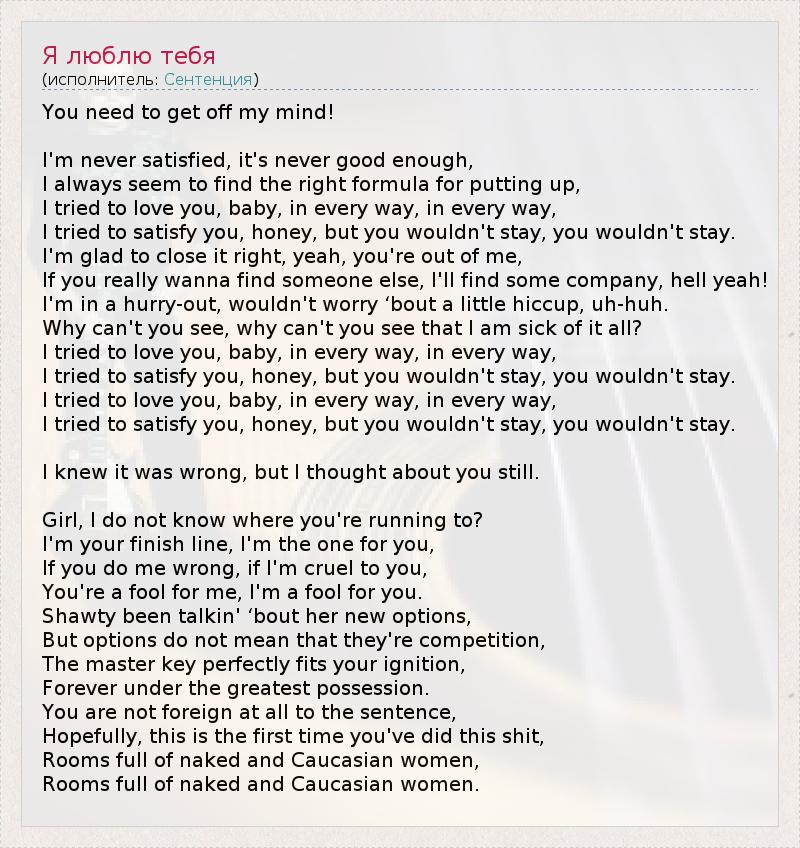 You need to get off my mind! I'm never satisfied, it's never good enough, I always seem to find the right formula for putting up, I tried to love you, baby, in every way, in every way, I tried to satisfy you, honey, but you wouldn't stay, you wouldn't stay. I'm glad to close it right, yeah, you're out of me, If you really wanna find someone else, I'll find some company, hell yeah! I'm in a hurry-out, wouldn't worry ‘bout a little hiccup, uh-huh. Why can't you see, why can't you see that I am sick of it all? I tried to love you, baby, in every way, in every way, I tried to satisfy you, honey, but you wouldn't stay, you wouldn't stay. I tried to love you, baby, in every way, in every way, I tried to satisfy you, honey, but you wouldn't stay, you wouldn't stay. I knew it was wrong, but I thought about you still. Girl, I do not know where you're running to? I'm your finish line, I'm the one for you, If you do me wrong, if I'm cruel to you, You're a fool for me, I'm a fool for you. Shawty been talkin' ‘bout her new options, But options do not mean that they're competition, The master key perfectly fits your ignition, Forever under the greatest possession. You are not foreign at all to the sentence, Hopefully, this is the first time you've did this shit, Rooms full of naked and Caucasian women, Rooms full of naked and Caucasian women.