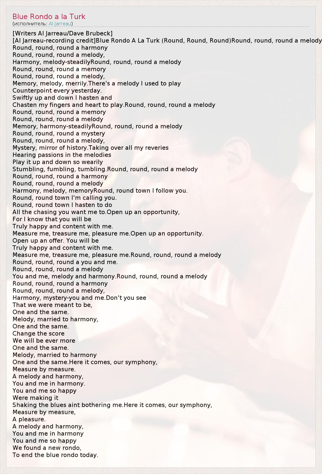 [Writers Al Jarreau/Dave Brubeck] [Al Jarreau-recording credit]Blue Rondo A La Turk (Round, Round, Round)Round, round, round a melody Round, round, round a harmony Round, round, round a melody, Harmony, melody-steadilyRound, round, round a melody Round, round, round a memory Round, round, round a melody, Memory, melody, merrily.There's a melody I used to play Counterpoint every yesterday. Swiftly up and down I hasten and Chasten my fingers and heart to play.Round, round, round a melody Round, round, round a memory Round, round, round a melody Memory, harmony-steadilyRound, round, round a melody Round, round, round a mystery Round, round, round a melody, Mystery, mirror of history.Taking over all my reveries Hearing passions in the melodies Play it up and down so wearily Stumbling, fumbling, tumbling.Round, round, round a melody Round, round, round a harmony Round, round, round a melody Harmony, melody, memoryRound, round town I follow you. Round, round town I'm calling you. Round, round town I hasten to do All the chasing you want me to.Open up an opportunity, For I know that you will be Truly happy and content with me. Measure me, treasure me, pleasure me.Open up an opportunity. Open up an offer. You will be Truly happy and content with me. Measure me, treasure me, pleasure me.Round, round, round a melody Round, round, round a you and me. Round, round, round a melody You and me, melody and harmony.Round, round, round a melody Round, round, round a harmony Round, round, round a melody, Harmony, mystery-you and me.Don't you see That we were meant to be, One and the same. Melody, married to harmony, One and the same. Change the score We will be ever more One and the same. Melody, married to harmony One and the same.Here it comes, our symphony, Measure by measure. A melody and harmony, You and me in harmony. You and me so happy Were making it Shaking the blues aint bothering me.Here it comes, our symphony, Measure by measure, A pleasure. A melody and harmony, You and me in harmony You and me so happy We found a new rondo, To end the blue rondo today.