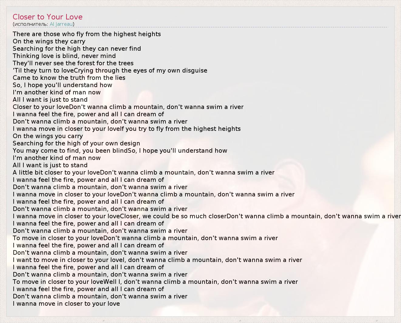 I want to move in closer to your loveI, don't wanna climb a mountain, don't wanna swim a river