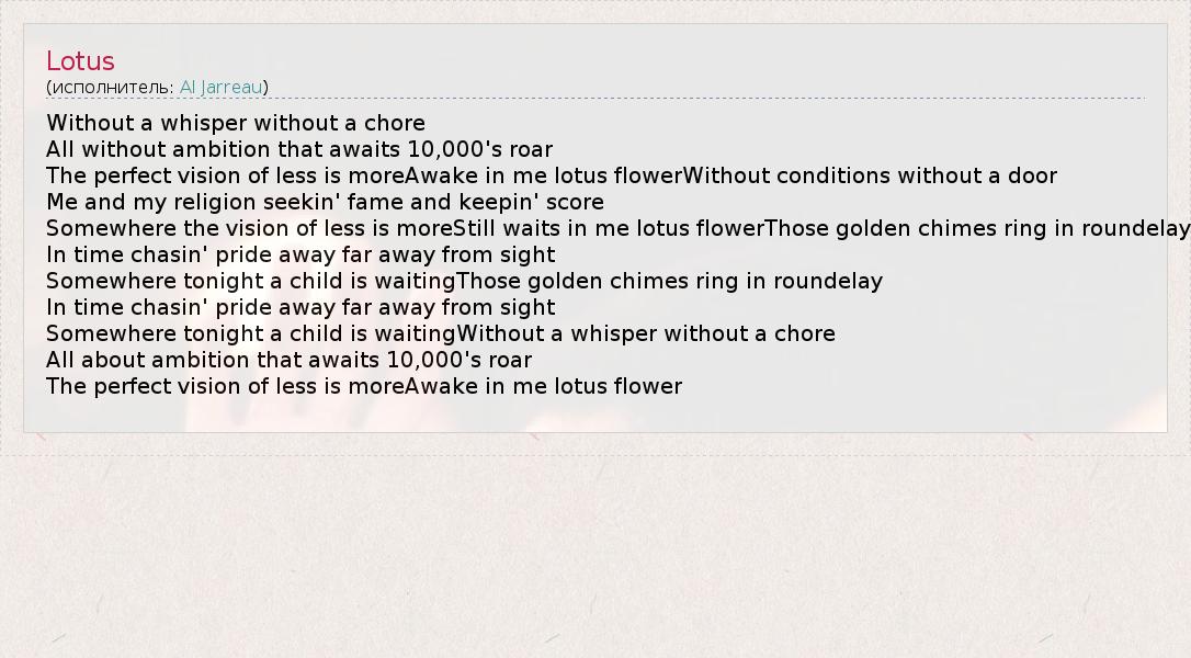 Somewhere the vision of less is moreStill waits in me lotus flowerThose golden chimes ring in roundelay
