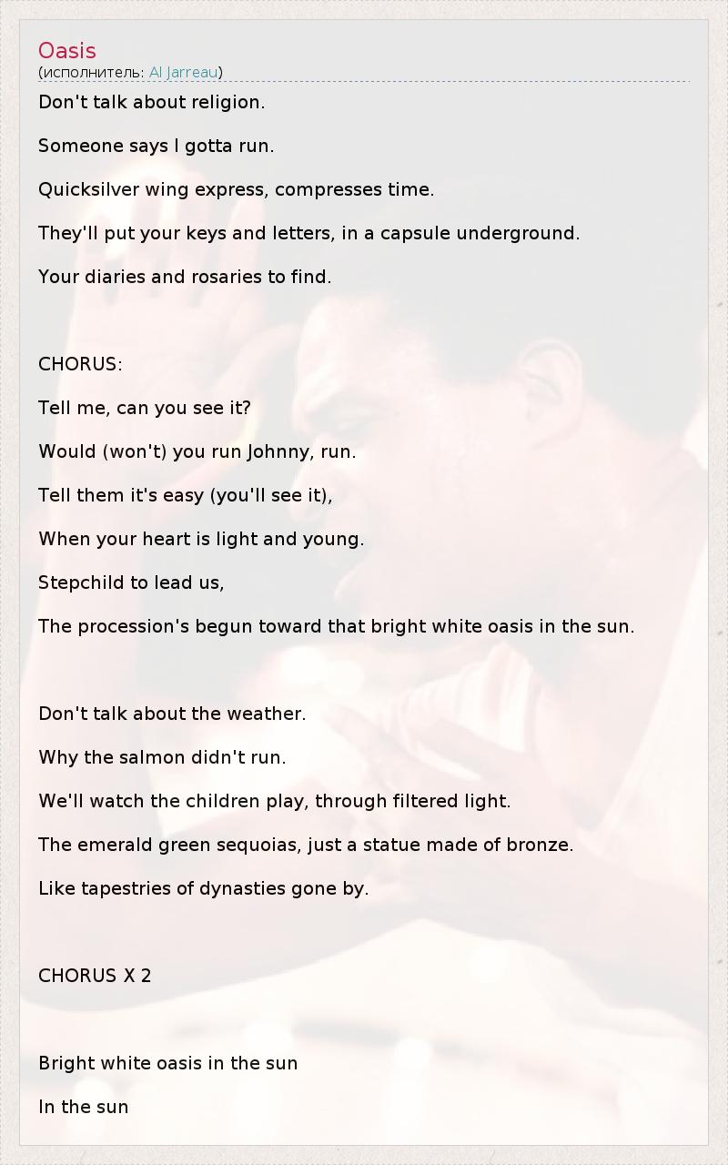 Don't talk about religion. Someone says I gotta run. Quicksilver wing express, compresses time. They'll put your keys and letters, in a capsule underground. Your diaries and rosaries to find. CHORUS: Tell me, can you see it? Would (won't) you run Johnny, run. Tell them it's easy (you'll see it), When your heart is light and young. Stepchild to lead us, The procession's begun toward that bright white oasis in the sun. Don't talk about the weather. Why the salmon didn't run. We'll watch the children play, through filtered light. The emerald green sequoias, just a statue made of bronze. Like tapestries of dynasties gone by. CHORUS X 2 Bright white oasis in the sun In the sun
