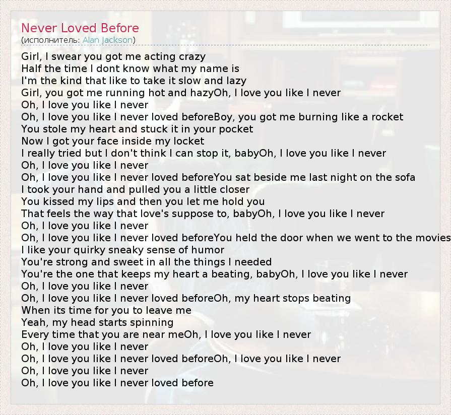 Girl, I swear you got me acting crazy Half the time I dont know what my name is I'm the kind that like to take it slow and lazy Girl, you got me running hot and hazyOh, I love you like I never Oh, I love you like I never Oh, I love you like I never loved beforeBoy, you got me burning like a rocket You stole my heart and stuck it in your pocket Now I got your face inside my locket I really tried but I don't think I can stop it, babyOh, I love you like I never Oh, I love you like I never Oh, I love you like I never loved beforeYou sat beside me last night on the sofa I took your hand and pulled you a little closer You kissed my lips and then you let me hold you That feels the way that love's suppose to, babyOh, I love you like I never Oh, I love you like I never Oh, I love you like I never loved beforeYou held the door when we went to the movies I like your quirky sneaky sense of humor You're strong and sweet in all the things I needed You're the one that keeps my heart a beating, babyOh, I love you like I never Oh, I love you like I never Oh, I love you like I never loved beforeOh, my heart stops beating When its time for you to leave me Yeah, my head starts spinning Every time that you are near meOh, I love you like I never Oh, I love you like I never Oh, I love you like I never loved beforeOh, I love you like I never Oh, I love you like I never Oh, I love you like I never loved before