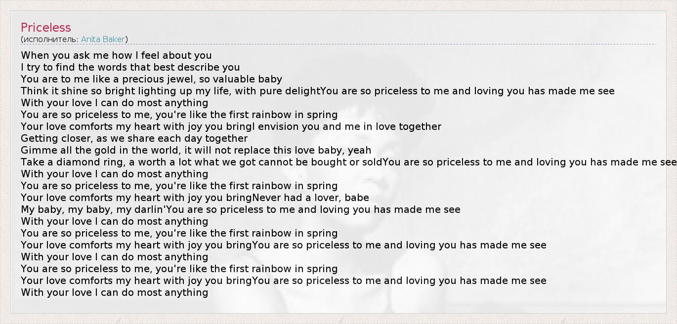 Take a diamond ring, a worth a lot what we got cannot be bought or soldYou are so priceless to me and loving you has made me see
