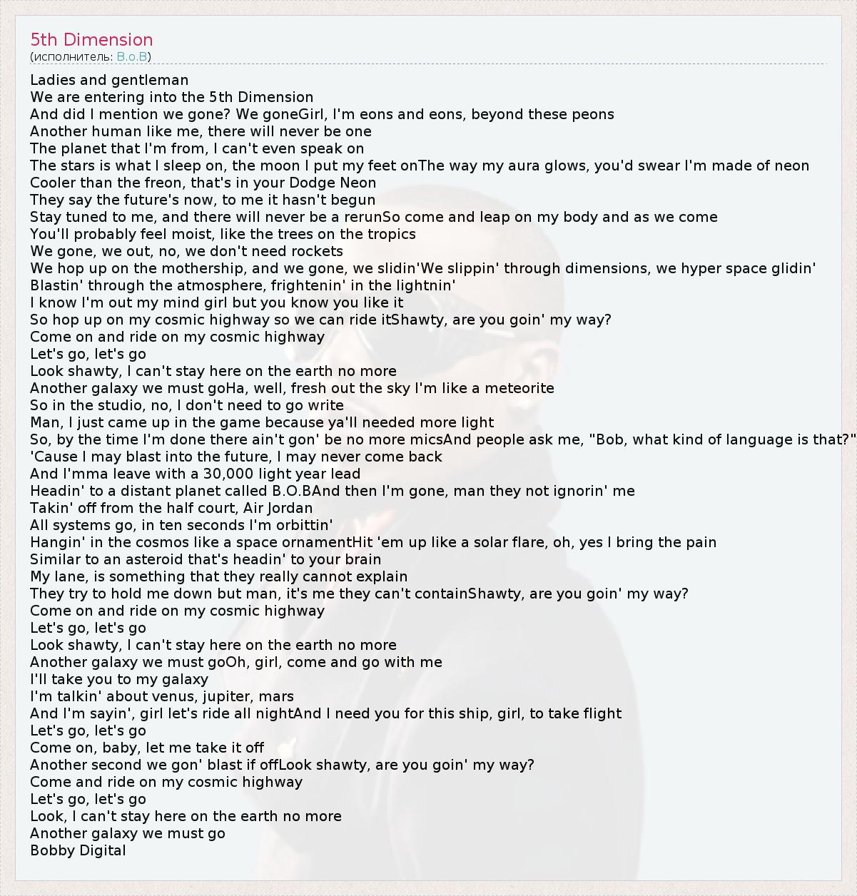 Ladies and gentleman We are entering into the 5th Dimension And did I mention we gone? We goneGirl, I'm eons and eons, beyond these peons Another human like me, there will never be one The planet that I'm from, I can't even speak on The stars is what I sleep on, the moon I put my feet onThe way my aura glows, you'd swear I'm made of neon Cooler than the freon, that's in your Dodge Neon They say the future's now, to me it hasn't begun Stay tuned to me, and there will never be a rerunSo come and leap on my body and as we come You'll probably feel moist, like the trees on the tropics We gone, we out, no, we don't need rockets We hop up on the mothership, and we gone, we slidin'We slippin' through dimensions, we hyper space glidin' Blastin' through the atmosphere, frightenin' in the lightnin' I know I'm out my mind girl but you know you like it So hop up on my cosmic highway so we can ride itShawty, are you goin' my way? Come on and ride on my cosmic highway Let's go, let's go Look shawty, I can't stay here on the earth no more Another galaxy we must goHa, well, fresh out the sky I'm like a meteorite So in the studio, no, I don't need to go write Man, I just came up in the game because ya'll needed more light So, by the time I'm done there ain't gon' be no more micsAnd people ask me, "Bob, what kind of language is that?" 'Cause I may blast into the future, I may never come back And I'mma leave with a 30,000 light year lead Headin' to a distant planet called B.O.BAnd then I'm gone, man they not ignorin' me Takin' off from the half court, Air Jordan All systems go, in ten seconds I'm orbittin' Hangin' in the cosmos like a space ornamentHit 'em up like a solar flare, oh, yes I bring the pain Similar to an asteroid that's headin' to your brain My lane, is something that they really cannot explain They try to hold me down but man, it's me they can't containShawty, are you goin' my way? Come on and ride on my cosmic highway Let's go, let's go Look shawty, I can't stay here on the earth no more Another galaxy we must goOh, girl, come and go with me I'll take you to my galaxy I'm talkin' about venus, jupiter, mars And I'm sayin', girl let's ride all nightAnd I need you for this ship, girl, to take flight Let's go, let's go Come on, baby, let me take it off Another second we gon' blast if offLook shawty, are you goin' my way? Come and ride on my cosmic highway Let's go, let's go Look, I can't stay here on the earth no more Another galaxy we must go Bobby Digital