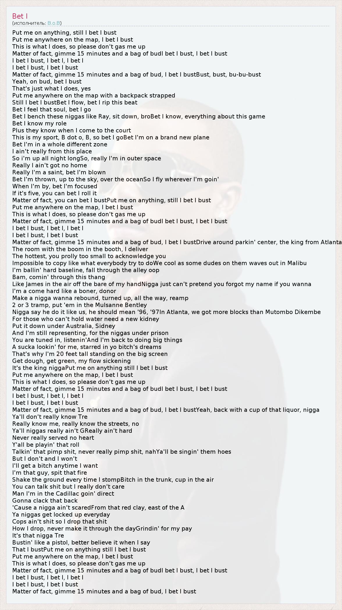 Put me on anything, still I bet I bust Put me anywhere on the map, I bet I bust This is what I does, so please don't gas me up Matter of fact, gimme 15 minutes and a bag of budI bet I bust, I bet I bust I bet I bust, I bet I, I bet I I bet I bust, I bet I bust Matter of fact, gimme 15 minutes and a bag of bud, I bet I bustBust, bust, bu-bu-bust Yeah, on bud, bet I bust That's just what I does, yes Put me anywhere on the map with a backpack strapped Still I bet I bustBet I flow, bet I rip this beat Bet I feel that soul, bet I go Bet I bench these niggas like Ray, sit down, broBet I know, everything about this game Bet I know my role Plus they know when I come to the court This is my sport, B dot o, B, so bet I goBet I'm on a brand new plane Bet I'm in a whole different zone I ain't really from this place So i'm up all night longSo, really I'm in outer space Really I ain't got no home Really I'm a saint, bet I'm blown Bet I'm thrown, up to the sky, over the oceanSo I fly wherever I'm goin' When I'm by, bet I'm focused If it's five, you can bet I roll it Matter of fact, you can bet I bustPut me on anything, still I bet I bust Put me anywhere on the map, I bet I bust This is what I does, so please don't gas me up Matter of fact, gimme 15 minutes and a bag of budI bet I bust, I bet I bust I bet I bust, I bet I, I bet I I bet I bust, I bet I bust Matter of fact, gimme 15 minutes and a bag of bud, I bet I bustDrive around parkin' center, the king from Atlanta The room with the boom in the booth, I deliver The hottest, you prolly too small to acknowledge you Impossible to copy like what everybody try to doWe cool as some dudes on them waves out in Malibu I'm ballin' hard baseline, fall through the alley oop Bam, comin' through this thang Like James in the air off the bare of my handNigga just can't pretend you forgot my name if you wanna I'm a come hard like a boner, donor Make a nigga wanna rebound, turned up, all the way, reamp 2 or 3 tramp, put 'em in the Mulsanne Bentley Nigga say he do it like us, he should mean '96, '97In Atlanta, we got more blocks than Mutombo Dikembe For those who can't hold water need a new kidney Put it down under Australia, Sidney And I'm still representing, for the niggas under prison You are tuned in, listenin'And I'm back to doing big things A sucka lookin' for me, starred in yo bitch's dreams That's why I'm 20 feet tall standing on the big screen Get dough, get green, my flow sickening It's the king niggaPut me on anything still I bet I bust Put me anywhere on the map, I bet I bust This is what I does, so please don't gas me up Matter of fact, gimme 15 minutes and a bag of budI bet I bust, I bet I bust I bet I bust, I bet I, I bet I I bet I bust, I bet I bust Matter of fact, gimme 15 minutes and a bag of bud, I bet I bustYeah, back with a cup of that liquor, nigga Ya'll don't really know Tre Really know me, really know the streets, no Ya'll niggas really ain't GReally ain't hard Never really served no heart Y'all be playin' that roll Talkin' that pimp shit, never really pimp shit, nahYa'll be singin' them hoes But I don't and I won't I'll get a bitch anytime I want I'm that guy, spit that fire Shake the ground every time I stompBitch in the trunk, cup in the air You can talk shit but I really don't care Man I'm in the Cadillac goin' direct Gonna clack that back 'Cause a nigga ain't scaredFrom that red clay, east of the A Ya niggas get locked up everyday Cops ain't shit so I drop that shit How I drop, never make it through the dayGrindin' for my pay It's that nigga Tre Bustin' like a pistol, better believe it when I say That I bustPut me on anything still I bet I bust Put me anywhere on the map, I bet I bust This is what I does, so please don't gas me up Matter of fact, gimme 15 minutes and a bag of budI bet I bust, I bet I bust I bet I bust, I bet I, I bet I I bet I bust, I bet I bust Matter of fact, gimme 15 minutes and a bag of bud, I bet I bust