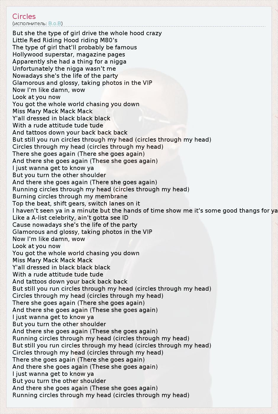But she the type of girl drive the whole hood crazy Little Red Riding Hood riding M80's The type of girl that'll probably be famous Hollywood superstar, magazine pages Apparently she had a thing for a nigga Unfortunately the nigga wasn't me Nowadays she's the life of the party Glamorous and glossy, taking photos in the VIP Now I'm like damn, wow Look at you now You got the whole world chasing you down Miss Mary Mack Mack Mack Y'all dressed in black black black With a rude attitude tude tude And tattoos down your back back back But still you run circles through my head (circles through my head) Circles through my head (circles through my head) There she goes again (There she goes again) And there she goes again (These she goes again) I just wanna get to know ya But you turn the other shoulder And there she goes again (There she goes again) Running circles through my head (circles through my head) Burning circles through my membrane Top the beat, shift gears, switch lanes on it I haven't seen ya in a minute but the hands of time show me it's some good thangs for ya Like a A-list celebrity, ain't gotta see ID Cause nowadays she's the life of the party Glamorous and glossy, taking photos in the VIP Now I'm like damn, wow Look at you now You got the whole world chasing you down Miss Mary Mack Mack Mack Y'all dressed in black black black With a rude attitude tude tude And tattoos down your back back back But still you run circles through my head (circles through my head) Circles through my head (circles through my head) There she goes again (There she goes again) And there she goes again (These she goes again) I just wanna get to know ya But you turn the other shoulder And there she goes again (These she goes again) Running circles through my head (circles through my head) But still you run circles through my head (circles through my head) Circles through my head (circles through my head) There she goes again (There she goes again) And there she goes again (These she goes again) I just wanna get to know ya But you turn the other shoulder And there she goes again (These she goes again) Running circles through my head (circles through my head)