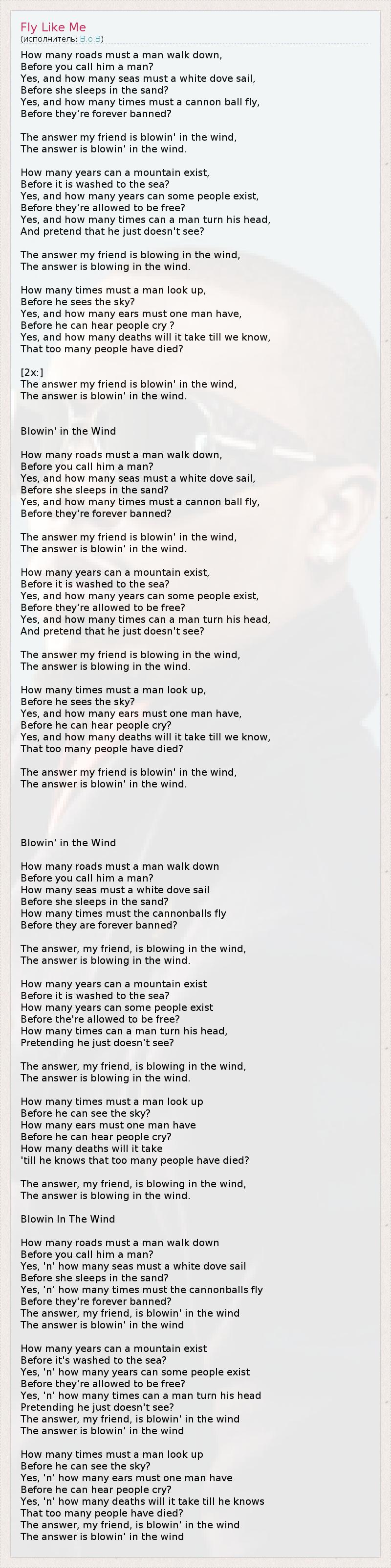 Сколько дорог должен пройти человек, Прежде чем его назовут человеком? Да, и сколько морей должна облететь белая голубка, Прежде чем уснуть на отмели? Да, и сколько должно ещё пролететь пушечных ядер, Прежде чем их навеки запретят? Ответ, мой друг, завис в воздухе, Ответ завис в воздухе. И сколько лет могут простоять горы, Прежде чем их смоет в море? Да, и сколько лет могут влачить существование некоторые люди, Прежде чем им позволят быть свободными? Да, и сколько раз человек может отворачиваться И притворяться, что он ничего не видел? Ответ, мой друг, завис в воздухе. Ответ завис в воздухе. Сколько раз человек должен взглянуть вверх, Прежде чем увидит небеса? Да, и сколько ушей должен иметь человек, Прежде чем он услышит людской плач? Да, и сколько смертей потребуется, ятобы понять, Что умерло слишком много людей? [2x:] Ответ, мой друг, завис в воздухе. Ответ завис в воздухе. Ответ носит ветер* (перевод К В Ковалев из Москвы) Как много дорог человеку пройти, Чтоб мужчиной считать его люди смогли? Как много морей пролететь голубям, Чтоб путь завершить свой к далёким краям? Как много народа погубит свинец, Чтоб оружие нам запретить наконец? На это ответ носит ветер, мой друг. На это ответ носит ветер. И сколько веков проскучает гора, Пока её смоет до моря вода? Как долго народам терпеть эти дни, Покуда свободу получат они? Как долго возможно крутить головой, Притворно не видя людей за собой? На это ответ носит ветер, мой друг. На это ответ носит ветер. И сколько же раз кто поднимет глаза, Пока обнаружит вверху небеса? И сколько кому нужно сразу ушей, Чтоб крики услышать голодных детей? Как много должно накопиться смертей, Чтоб враз осознать, сколько гибнет людей? На это ответ носит ветер, мой друг. На это ответ носит ветер. * поэтический перевод Витает в воздухе (перевод Fox Kids) Сколько дорог должен пройти человек, Прежде чем вы назовете его человеком? Сколько морей должен пересечь белый голубь, Прежде чем навеки уснуть в песках? Сколько раз должно пролететь пушечное ядро, Прежде чем оно будет навсегда запрещено? Ответ, мой друг, витает в воздухе. Ответ летает в воздухе. Сколько лет должна просуществовать гора, Прежде чем будет смыта морем? Сколько лет должны существовать некоторые люди, Прежде чем будут отпущены на свободу? Сколько раз может человек поворачивать голову, Притворяясь, что ничего не видит? Ответ, мой друг, витает в воздухе. Ответ летает в воздухе. Сколько раз должен человек поднять голову, Прежде чем он сможет видеть небо? Сколько ушей должен человек иметь, Прежде чем сможет слышать плач других? Сколько смертей должно случиться, Прежде чем он поймёт, что умерло слишком много? Ответ, мой друг, витает в воздухе. Ответ летает в воздухе. Уносится прочь (перевод Reterpretni) Сколько дорог должен пройти человек, Прежде, чем им он станет навек? Да, сколько морей голубке лететь, Прежде, чем на песок мирно слечь? Да, сколько еще пушки запалят, Прежде, чем их навек запретят ? Ответ-то, мой друг, уносится прочь, Ответ-то – уносится прочь. Сколько лет еще жить горе, Прежде, чем будет та смыта в море? Да, сколько лет могут люди прожить, Прежде, чем позволят себе свободными быть? Да, как долго может человек вертеть головой, Притворяясь, что он слепой? Ответ-то, мой друг, уносится прочь, Ответ-то – уносится прочь. Сколько можно еще поднимать глаза, Прежде, чем увидеть как чисты небес