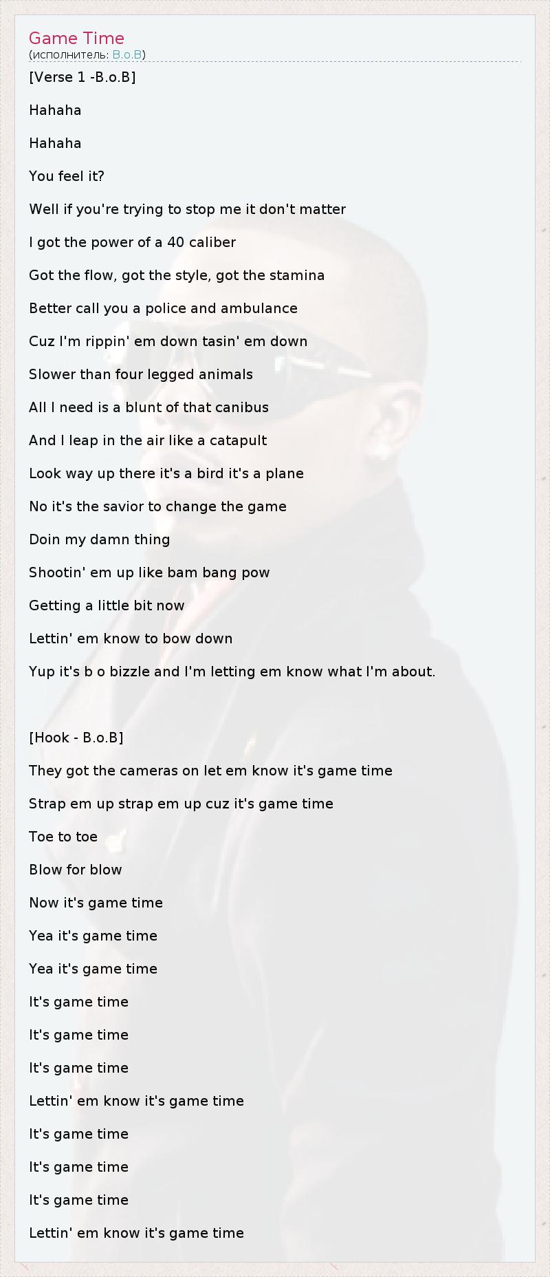 [Verse 1 -B.o.B] Hahaha Hahaha You feel it? Well if you're trying to stop me it don't matter I got the power of a 40 caliber Got the flow, got the style, got the stamina Better call you a police and ambulance Cuz I'm rippin' em down tasin' em down Slower than four legged animals All I need is a blunt of that canibus And I leap in the air like a catapult Look way up there it's a bird it's a plane No it's the savior to change the game Doin my damn thing Shootin' em up like bam bang pow Getting a little bit now Lettin' em know to bow down Yup it's b o bizzle and I'm letting em know what I'm about. [Hook - B.o.B] They got the cameras on let em know it's game time Strap em up strap em up cuz it's game time Toe to toe Blow for blow Now it's game time Yea it's game time Yea it's game time It's game time It's game time It's game time Lettin' em know it's game time It's game time It's game time It's game time Lettin' em know it's game time