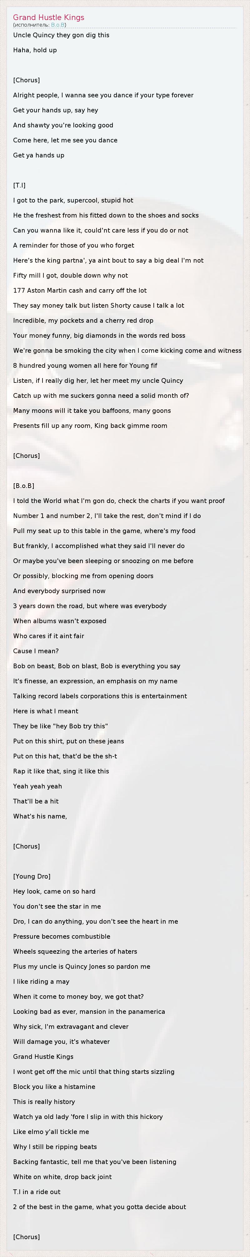 Uncle Quincy they gon dig this Haha, hold up [Chorus] Alright people, I wanna see you dance if your type forever Get your hands up, say hey And shawty you're looking good Come here, let me see you dance Get ya hands up [T.I] I got to the park, supercool, stupid hot He the freshest from his fitted down to the shoes and socks Can you wanna like it, could'nt care less if you do or not A reminder for those of you who forget Here's the king partna', ya aint bout to say a big deal I'm not Fifty mill I got, double down why not 177 Aston Martin cash and carry off the lot They say money talk but listen Shorty cause I talk a lot Incredible, my pockets and a cherry red drop Your money funny, big diamonds in the words red boss We're gonna be smoking the city when I come kicking come and witness 8 hundred young women all here for Young fif Listen, if I really dig her, let her meet my uncle Quincy Catch up with me suckers gonna need a solid month of? Many moons will it take you baffoons, many goons Presents fill up any room, King back gimme room [Chorus] [B.o.B] I told the World what I'm gon do, check the charts if you want proof Number 1 and number 2, I'll take the rest, don't mind if I do Pull my seat up to this table in the game, where's my food But frankly, I accomplished what they said I'll never do Or maybe you've been sleeping or snoozing on me before Or possibly, blocking me from opening doors And everybody surprised now 3 years down the road, but where was everybody When albums wasn't exposed Who cares if it aint fair Cause I mean? Bob on beast, Bob on blast, Bob is everything you say It's finesse, an expression, an emphasis on my name Talking record labels corporations this is entertainment Here is what I meant They be like "hey Bob try this" Put on this shirt, put on these jeans Put on this hat, that'd be the sh-t Rap it like that, sing it like this Yeah yeah yeah That'll be a hit What's his name, [Chorus] [Young Dro] Hey look, came on so hard You don't see the star in me Dro, I can do anything, you don't see the heart in me Pressure becomes combustible Wheels squeezing the arteries of haters Plus my uncle is Quincy Jones so pardon me I like riding a may When it come to money boy, we got that? Looking bad as ever, mansion in the panamerica Why sick, I'm extravagant and clever Will damage you, it's whatever Grand Hustle Kings I wont get off the mic until that thing starts sizzling Block you like a histamine This is really history Watch ya old lady 'fore I slip in with this hickory Like elmo y'all tickle me Why I still be ripping beats Backing fantastic, tell me that you've been listening White on white, drop back joint T.I in a ride out 2 of the best in the game, what you gotta decide about [Chorus]