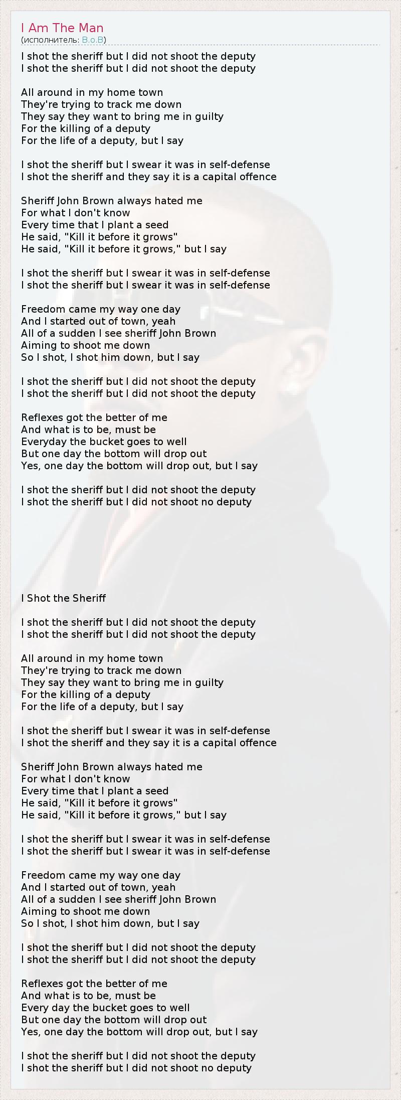 I shot the sheriff but I did not shoot the deputy I shot the sheriff but I did not shoot the deputy All around in my home town They're trying to track me down They say they want to bring me in guilty For the killing of a deputy For the life of a deputy, but I say I shot the sheriff but I swear it was in self-defense I shot the sheriff and they say it is a capital offence Sheriff John Brown always hated me For what I don't know Every time that I plant a seed He said, "Kill it before it grows" He said, "Kill it before it grows," but I say I shot the sheriff but I swear it was in self-defense I shot the sheriff but I swear it was in self-defense Freedom came my way one day And I started out of town, yeah All of a sudden I see sheriff John Brown Aiming to shoot me down So I shot, I shot him down, but I say I shot the sheriff but I did not shoot the deputy I shot the sheriff but I did not shoot the deputy Reflexes got the better of me And what is to be, must be Everyday the bucket goes to well But one day the bottom will drop out Yes, one day the bottom will drop out, but I say I shot the sheriff but I did not shoot the deputy I shot the sheriff but I did not shoot no deputy I Shot the Sheriff I shot the sheriff but I did not shoot the deputy I shot the sheriff but I did not shoot the deputy All around in my home town They're trying to track me down They say they want to bring me in guilty For the killing of a deputy For the life of a deputy, but I say I shot the sheriff but I swear it was in self-defense I shot the sheriff and they say it is a capital offence Sheriff John Brown always hated me For what I don't know Every time that I plant a seed He said, "Kill it before it grows" He said, "Kill it before it grows," but I say I shot the sheriff but I swear it was in self-defense I shot the sheriff but I swear it was in self-defense Freedom came my way one day And I started out of town, yeah All of a sudden I see sheriff John Brown Aiming to shoot me down So I shot, I shot him down, but I say I shot the sheriff but I did not shoot the deputy I shot the sheriff but I did not shoot the deputy Reflexes got the better of me And what is to be, must be Every day the bucket goes to well But one day the bottom will drop out Yes, one day the bottom will drop out, but I say I shot the sheriff but I did not shoot the deputy I shot the sheriff but I did not shoot no deputy