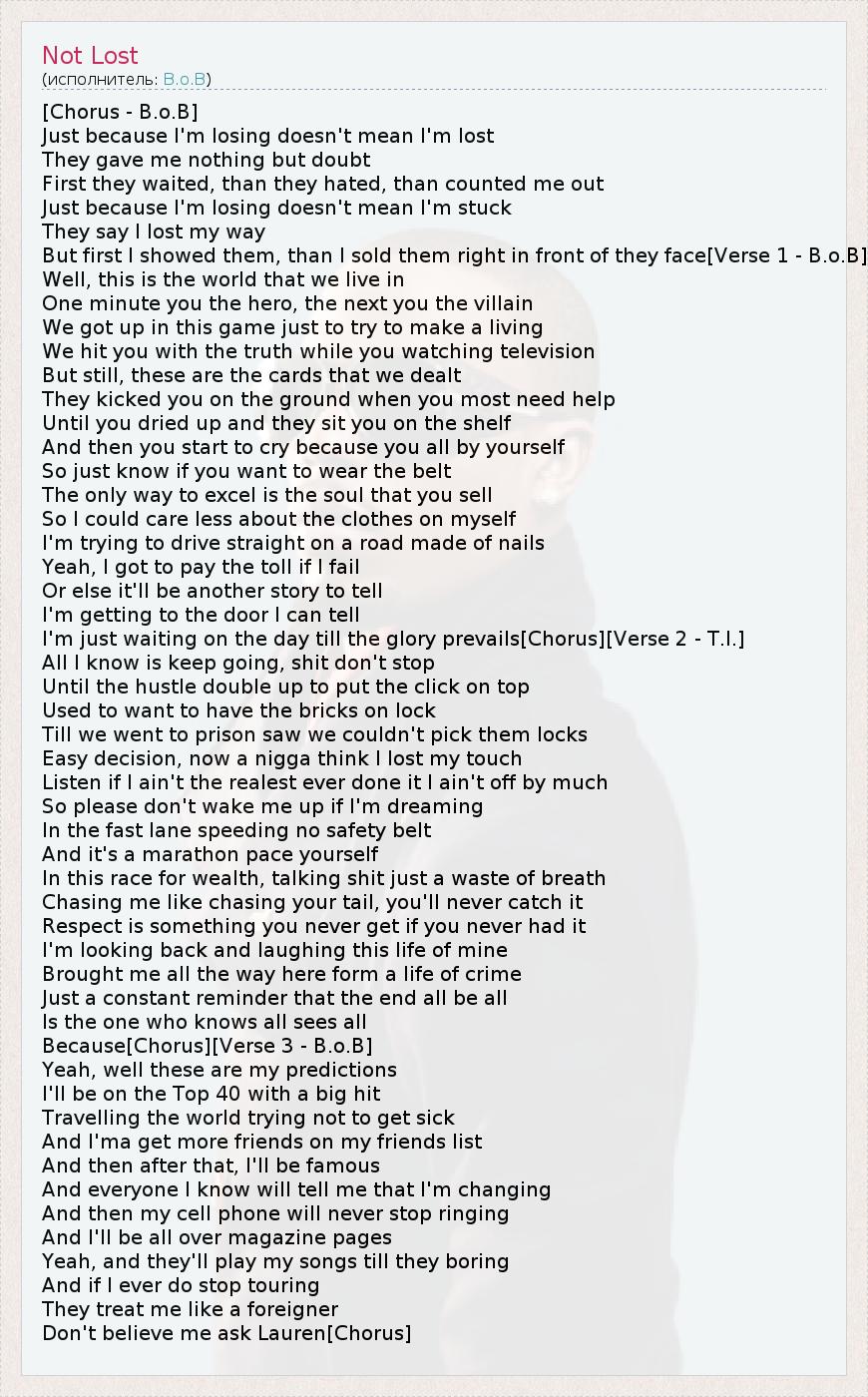 [Chorus - B.o.B] Just because I'm losing doesn't mean I'm lost They gave me nothing but doubt First they waited, than they hated, than counted me out Just because I'm losing doesn't mean I'm stuck They say I lost my way But first I showed them, than I sold them right in front of they face[Verse 1 - B.o.B] Well, this is the world that we live in One minute you the hero, the next you the villain We got up in this game just to try to make a living We hit you with the truth while you watching television But still, these are the cards that we dealt They kicked you on the ground when you most need help Until you dried up and they sit you on the shelf And then you start to cry because you all by yourself So just know if you want to wear the belt The only way to excel is the soul that you sell So I could care less about the clothes on myself I'm trying to drive straight on a road made of nails Yeah, I got to pay the toll if I fail Or else it'll be another story to tell I'm getting to the door I can tell I'm just waiting on the day till the glory prevails[Chorus][Verse 2 - T.I.] All I know is keep going, shit don't stop Until the hustle double up to put the click on top Used to want to have the bricks on lock Till we went to prison saw we couldn't pick them locks Easy decision, now a nigga think I lost my touch Listen if I ain't the realest ever done it I ain't off by much So please don't wake me up if I'm dreaming In the fast lane speeding no safety belt And it's a marathon pace yourself In this race for wealth, talking shit just a waste of breath Chasing me like chasing your tail, you'll never catch it Respect is something you never get if you never had it I'm looking back and laughing this life of mine Brought me all the way here form a life of crime Just a constant reminder that the end all be all Is the one who knows all sees all Because[Chorus][Verse 3 - B.o.B] Yeah, well these are my predictions I'll be on the Top 40 with a big hit Travelling the world trying not to get sick And I'ma get more friends on my friends list And then after that, I'll be famous And everyone I know will tell me that I'm changing And then my cell phone will never stop ringing And I'll be all over magazine pages Yeah, and they'll play my songs till they boring And if I ever do stop touring They treat me like a foreigner Don't believe me ask Lauren[Chorus]