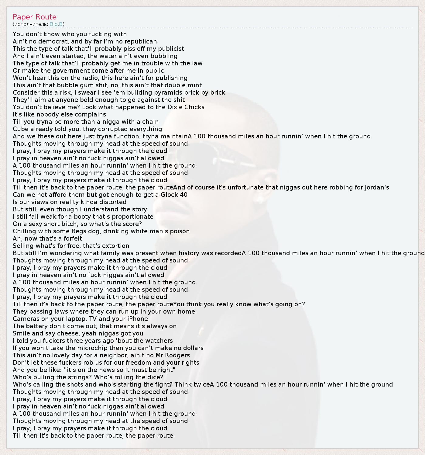 You don't know who you fucking with Ain't no democrat, and by far I'm no republican This the type of talk that'll probably piss off my publicist And I ain't even started, the water ain't even bubbling The type of talk that'll probably get me in trouble with the law Or make the government come after me in public Won't hear this on the radio, this here ain't for publishing This ain't that bubble gum shit, no, this ain't that double mint Consider this a risk, I swear I see 'em building pyramids brick by brick They'll aim at anyone bold enough to go against the shit You don't believe me? Look what happened to the Dixie Chicks It's like nobody else complains Till you tryna be more than a nigga with a chain Cube already told you, they corrupted everything And we these out here just tryna function, tryna maintainA 100 thousand miles an hour runnin' when I hit the ground Thoughts moving through my head at the speed of sound I pray, I pray my prayers make it through the cloud I pray in heaven ain't no fuck niggas ain't allowed A 100 thousand miles an hour runnin' when I hit the ground Thoughts moving through my head at the speed of sound I pray, I pray my prayers make it through the cloud Till then it's back to the paper route, the paper routeAnd of course it's unfortunate that niggas out here robbing for Jordan's Can we not afford them but got enough to get a Glock 40 Is our views on reality kinda distorted But still, even though I understand the story I still fall weak for a booty that's proportionate On a sexy short bitch, so what's the score? Chilling with some Regs dog, drinking white man's poison Ah, now that's a forfeit Selling what's for free, that's extortion But still I'm wondering what family was present when history was recordedA 100 thousand miles an hour runnin' when I hit the ground Thoughts moving through my head at the speed of sound I pray, I pray my prayers make it through the cloud I pray in heaven ain't no fuck niggas ain't allowed A 100 thousand miles an hour runnin' when I hit the ground Thoughts moving through my head at the speed of sound I pray, I pray my prayers make it through the cloud Till then it's back to the paper route, the paper routeYou think you really know what's going on? They passing laws where they can run up in your own home Cameras on your laptop, TV and your iPhone The battery don't come out, that means it's always on Smile and say cheese, yeah niggas got you I told you fuckers three years ago 'bout the watchers If you won't take the microchip then you can't make no dollars This ain't no lovely day for a neighbor, ain't no Mr Rodgers Don't let these fuckers rob us for our freedom and your rights And you be like: "it's on the news so it must be right" Who's pulling the strings? Who's rolling the dice? Who's calling the shots and who's starting the fight? Think twiceA 100 thousand miles an hour runnin' when I hit the ground Thoughts moving through my head at the speed of sound I pray, I pray my prayers make it through the cloud I pray in heaven ain't no fuck niggas ain't allowed A 100 thousand miles an hour runnin' when I hit the ground Thoughts moving through my head at the speed of sound I pray, I pray my prayers make it through the cloud Till then it's back to the paper route, the paper route
