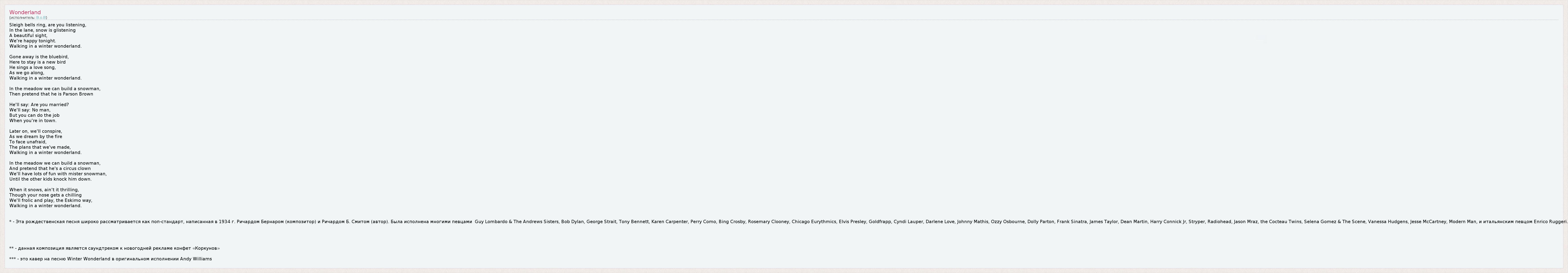 Sleigh bells ring, are you listening, In the lane, snow is glistening A beautiful sight, We're happy tonight. Walking in a winter wonderland. Gone away is the bluebird, Here to stay is a new bird He sings a love song, As we go along, Walking in a winter wonderland. In the meadow we can build a snowman, Then pretend that he is Parson Brown He'll say: Are you married? We'll say: No man, But you can do the job When you're in town. Later on, we'll conspire, As we dream by the fire To face unafraid, The plans that we've made, Walking in a winter wonderland. In the meadow we can build a snowman, And pretend that he's a circus clown We'll have lots of fun with mister snowman, Until the other kids knock him down. When it snows, ain't it thrilling, Though your nose gets a chilling We'll frolic and play, the Eskimo way, Walking in a winter wonderland. * - Эта рождественская песня широко рассматривается как поп-стандарт, написанная в 1934 г. Ричардом Бернаром (композитор) и Ричардом Б. Смитом (автор). Была исполнена многими певцами Guy Lombardo & The Andrews Sisters, Bob Dylan, George Strait, Tony Bennett, Karen Carpenter, Perry Como, Bing Crosby, Rosemary Clooney, Chicago Eurythmics, Elvis Presley, Goldfrapp, Cyndi Lauper, Darlene Love, Johnny Mathis, Ozzy Osbourne, Dolly Parton, Frank Sinatra, James Taylor, Dean Martin, Harry Connick Jr, Stryper, Radiohead, Jason Mraz, the Cocteau Twins, Selena Gomez & The Scene, Vanessa Hudgens, Jesse McCartney, Modern Man, и итальянским певцом Enrico Ruggeri. ** - данная композиция является саундтреком к новогодней рекламе конфет «Коркунов» *** - это кавер на песню Winter Wonderland в оригинальном исполнении Andy Williams