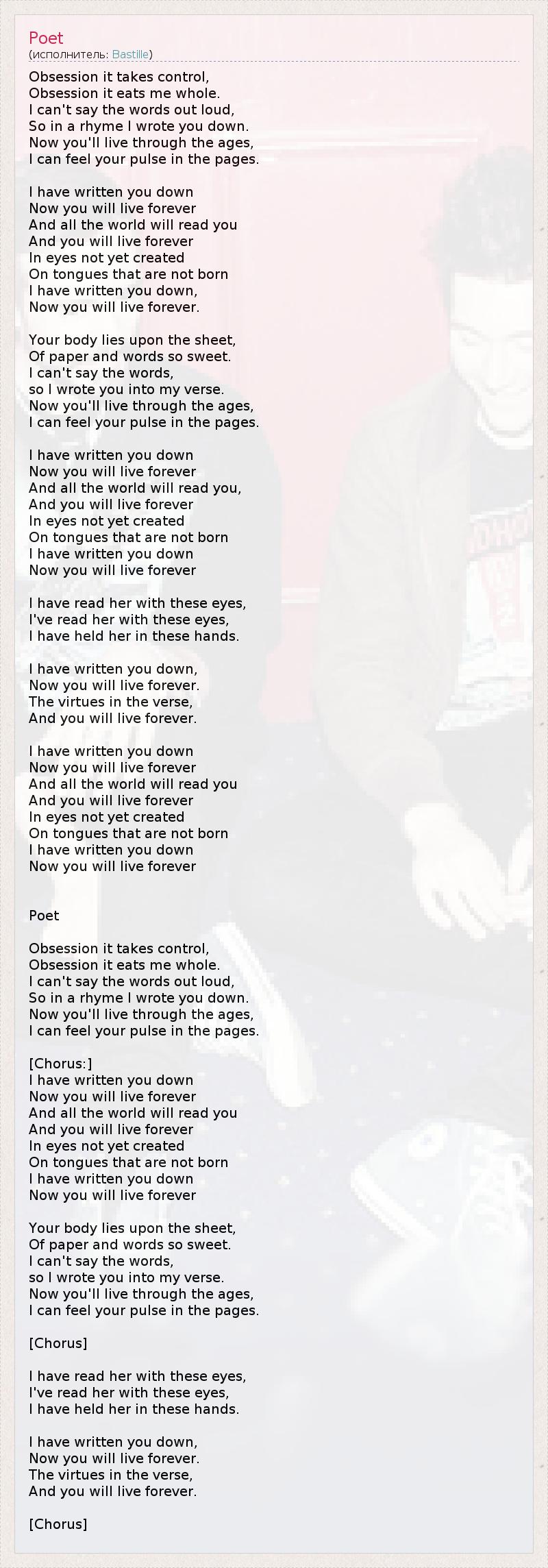 Одержимость — она берёт под свой контроль, Одержимость — она пожирает меня целиком. Я не могу произносить слова вслух, Поэтому в рифму я написал Вам вниз. Теперь ты будешь жить на протяжении веков, Я чувствую твой пульс на страницах. Я написал тебе вниз Теперь ты будешь жить вечно, И весь мир будет читать тебя, И ты будешь жить вечно. В глазах ещё не создан, На языках, которые не рождаются. Я написал тебе вниз, Теперь ты будешь жить вечно. Твоё тело лежит на простынях, Бумага и слова так сладки. Я не могу выразить словами, Поэтому я написал тебе стихи, Теперь ты будешь жить на протяжении веков, Я чувствую твой пульс на страницах. Я написал тебе вниз. Теперь ты будешь жить вечно. И весь мир будет читать тебя, И ты будешь жить вечно. В глазах ещё не создан, На языках, которые не рождаются. Я написал тебе вниз, Теперь ты будешь жить вечно. Я прочитал её вместе с этими глазами, Я прочитал её вместе с этими глазами, Я держал её в этих руках. Я написал тебе вниз. Теперь ты будешь жить вечно, Достоинства в стихах. И ты будешь жить вечно Я написал тебе вниз. Теперь ты будешь жить на протяжении веков. И весь мир будет читать тебя, И ты будешь жить вечно. В глазах ещё не создан, На языках, которые не рождаются. Я написал тебе вниз, Теперь ты будешь жить вечно. Поэт (перевод Ксения из Омска) Одержимость охватывает меня, Одержимость пожирает меня. Я не могу сказать ни слова, Поэтому я взял ручку и записал тебя. Теперь ты будешь жить ещё столетия. Я на страницах чувствую твой пульс. [Припев:] Я взял ручку и записал тебя, Теперь ты будешь жить вечно. И весь мир будет тебя читать, И ты будешь жить вечно В глазах тех, которые ещё не созданы, На языках тех, которые ещё не рождены. Я взял ручку и записал тебя. Теперь ты будешь жить вечно. Твоё тело лежит на листе Бумаги, твое тело – сладкие слова. Я не могу сказать ни слова, Поэтому я взял ручку и написал стихотворение. Теперь ты будешь жить ещё столетия. Я на страницах чувствую твой пульс. [Припев] Я читал её этими глазами, Я читал её этими глазами, Я держал её в этих руках. Я взял ручку и записал тебя. Теперь ты будешь жить вечно. Вся сила небесная - в стихах, И ты будешь жить вечно. [Припев]