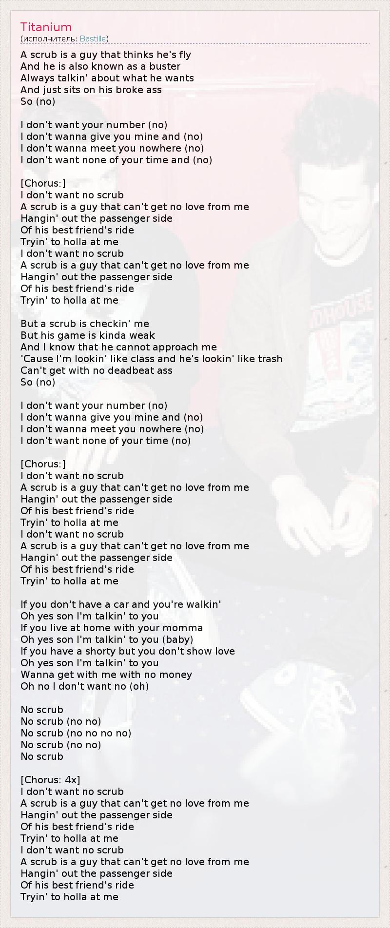 A scrub is a guy that thinks he's fly And he is also known as a buster Always talkin' about what he wants And just sits on his broke ass So (no) I don't want your number (no) I don't wanna give you mine and (no) I don't wanna meet you nowhere (no) I don't want none of your time and (no) [Chorus:] I don't want no scrub A scrub is a guy that can't get no love from me Hangin' out the passenger side Of his best friend's ride Tryin' to holla at me I don't want no scrub A scrub is a guy that can't get no love from me Hangin' out the passenger side Of his best friend's ride Tryin' to holla at me But a scrub is checkin' me But his game is kinda weak And I know that he cannot approach me 'Cause I'm lookin' like class and he's lookin' like trash Can't get with no deadbeat ass So (no) I don't want your number (no) I don't wanna give you mine and (no) I don't wanna meet you nowhere (no) I don't want none of your time (no) [Chorus:] I don't want no scrub A scrub is a guy that can't get no love from me Hangin' out the passenger side Of his best friend's ride Tryin' to holla at me I don't want no scrub A scrub is a guy that can't get no love from me Hangin' out the passenger side Of his best friend's ride Tryin' to holla at me If you don't have a car and you're walkin' Oh yes son I'm talkin' to you If you live at home with your momma Oh yes son I'm talkin' to you (baby) If you have a shorty but you don't show love Oh yes son I'm talkin' to you Wanna get with me with no money Oh no I don't want no (oh) No scrub No scrub (no no) No scrub (no no no no) No scrub (no no) No scrub [Chorus: 4х] I don't want no scrub A scrub is a guy that can't get no love from me Hangin' out the passenger side Of his best friend's ride Tryin' to holla at me I don't want no scrub A scrub is a guy that can't get no love from me Hangin' out the passenger side Of his best friend's ride Tryin' to holla at me