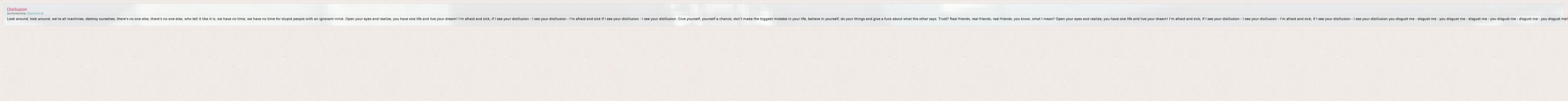 Look around, look around, we're all machines, destroy ourselves, there's no one else, there's no one else, who tell it like it is, we have no time, we have no time for stupid people with an ignorant mind. Open your eyes and realize, you have one life and live your dream! I'm afraid and sick, if I see your disillusion - I see your disillusion - I'm afraid and sick if I see your disillusion - I see your disillusion. Give yourself, yourself a chance, don't make the biggest mistake in your life, believe in yourself, do your things and give a fuck about what the other says. Trust? Real friends, real friends, real friends, you know, what I mean? Open your eyes and realize, you have one life and live your dream! I'm afraid and sick, if I see your disillusion - I see your disillusion - I'm afraid and sick, if I see your disillusion - I see your disillusion you disgust me - disgust me - you disgust me - disgust me - you disgust me - disgust me - you disgust me!