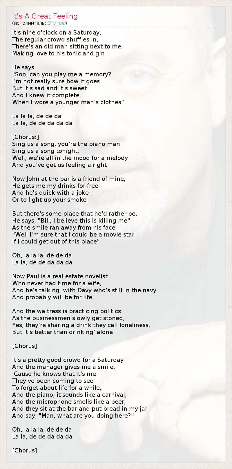 Это интересно:Билли Джоэл (Billy Joel, полное имя Уильям Мартин Джоэл, William Martin Joel, род. 9 мая 1949 г. в Бронксе) — американский автор-исполнитель песен и пианист, один из шести наиболее продаваемых артистов в США за всю историю страны. Обладатель шести наград «Грэмми», в том числе в таких престижных номинациях, как «альбом года» («52nd Street», 1979), «запись года» и «песня года» («Just the Way You Are», 1978).БиографияДжоэл... продолжение
