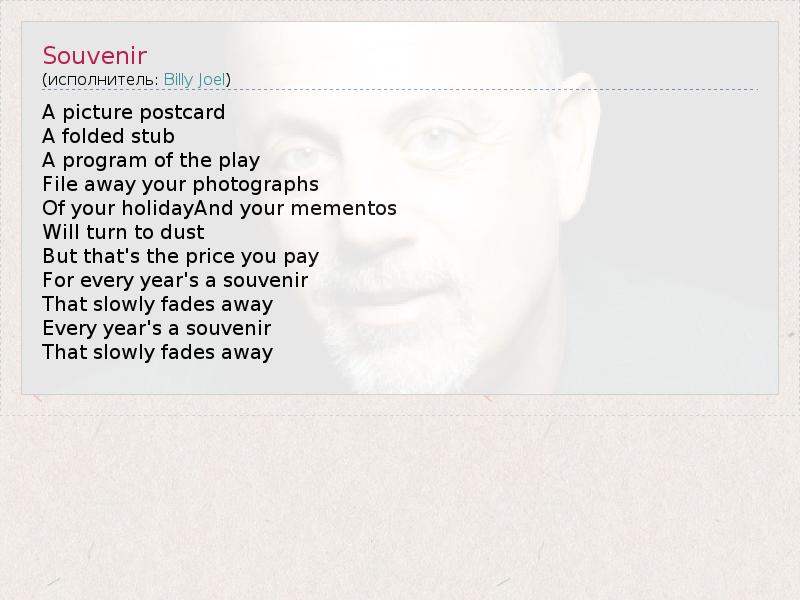 Это интересно:Билли Джоэл (Billy Joel, полное имя Уильям Мартин Джоэл, William Martin Joel, род. 9 мая 1949 г. в Бронксе) — американский автор-исполнитель песен и пианист, один из шести наиболее продаваемых артистов в США за всю историю страны. Обладатель шести наград «Грэмми», в том числе в таких престижных номинациях, как «альбом года» («52nd Street», 1979), «запись года» и «песня года» («Just the Way You Are», 1978).БиографияДжоэл... продолжение