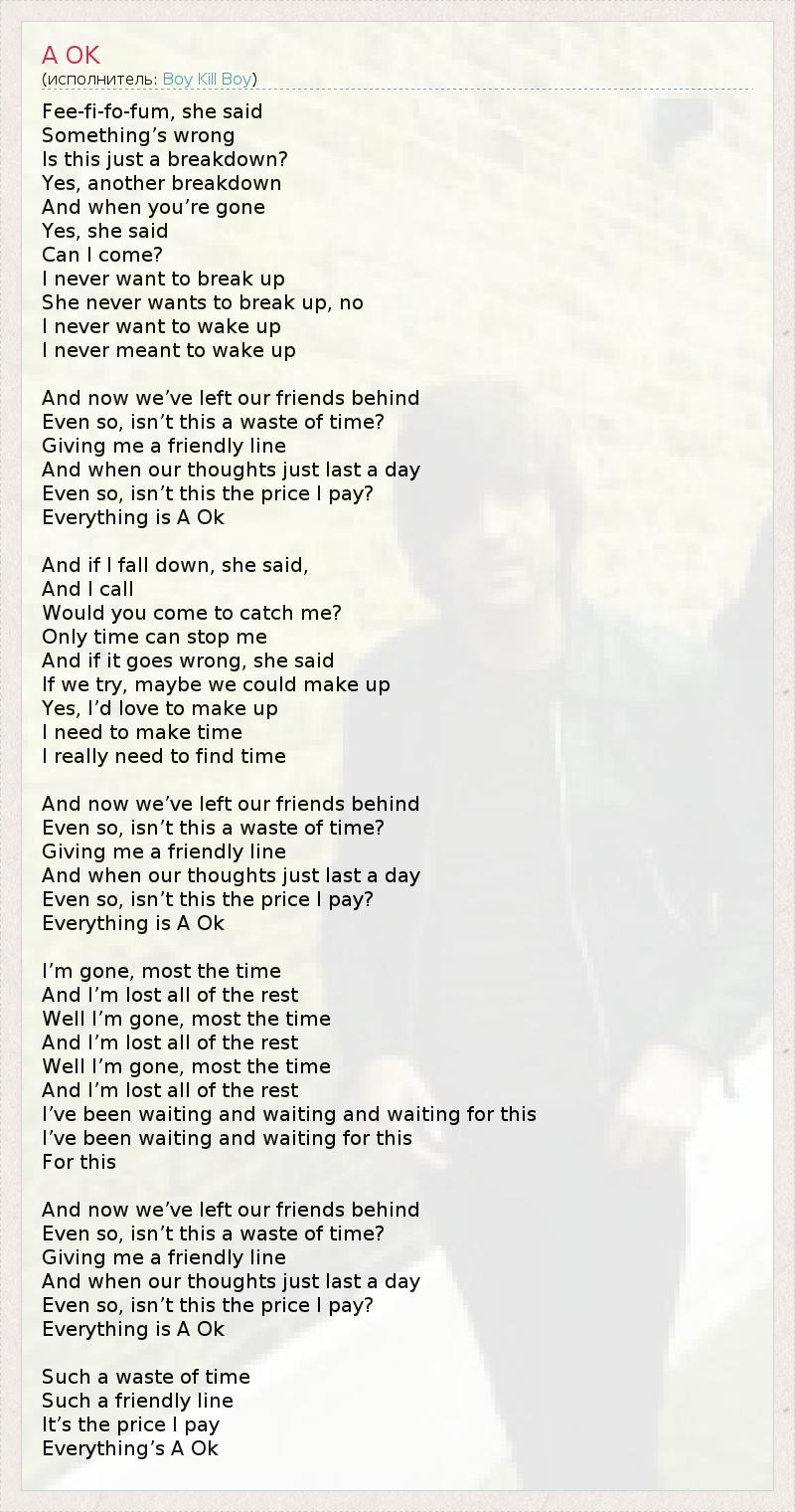 Fee-fi-fo-fum, she said Something’s wrong Is this just a breakdown? Yes, another breakdown And when you’re gone Yes, she said Can I come? I never want to break up She never wants to break up, no I never want to wake up I never meant to wake up And now we’ve left our friends behind Even so, isn’t this a waste of time? Giving me a friendly line And when our thoughts just last a day Even so, isn’t this the price I pay? Everything is A Ok And if I fall down, she said, And I call Would you come to catch me? Only time can stop me And if it goes wrong, she said If we try, maybe we could make up Yes, I’d love to make up I need to make time I really need to find time And now we’ve left our friends behind Even so, isn’t this a waste of time? Giving me a friendly line And when our thoughts just last a day Even so, isn’t this the price I pay? Everything is A Ok I’m gone, most the time And I’m lost all of the rest Well I’m gone, most the time And I’m lost all of the rest Well I’m gone, most the time And I’m lost all of the rest I’ve been waiting and waiting and waiting for this I’ve been waiting and waiting for this For this And now we’ve left our friends behind Even so, isn’t this a waste of time? Giving me a friendly line And when our thoughts just last a day Even so, isn’t this the price I pay? Everything is A Ok Such a waste of time Such a friendly line It’s the price I pay Everything’s A Ok