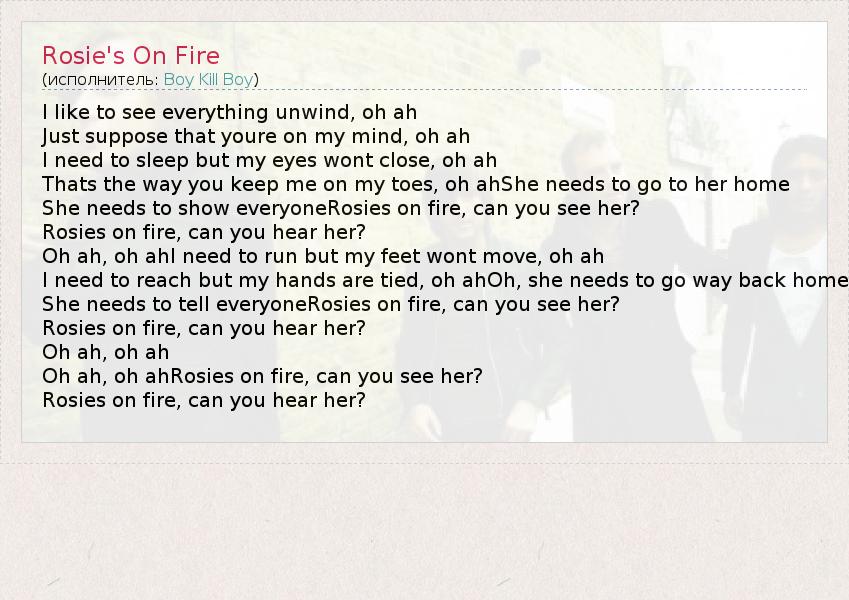 А как ты думаешь, о чем песня "Rosie's On Fire" ?