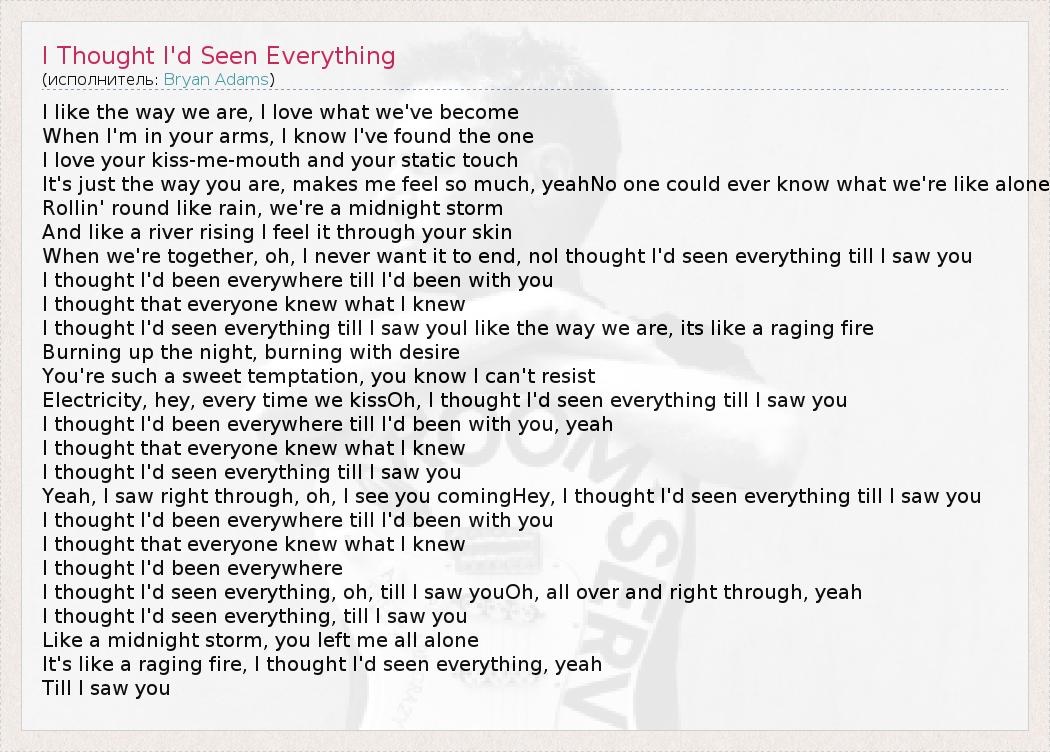 ГлавнаяИсполнителиBryan AdamsI Thought I'd Seen Everything