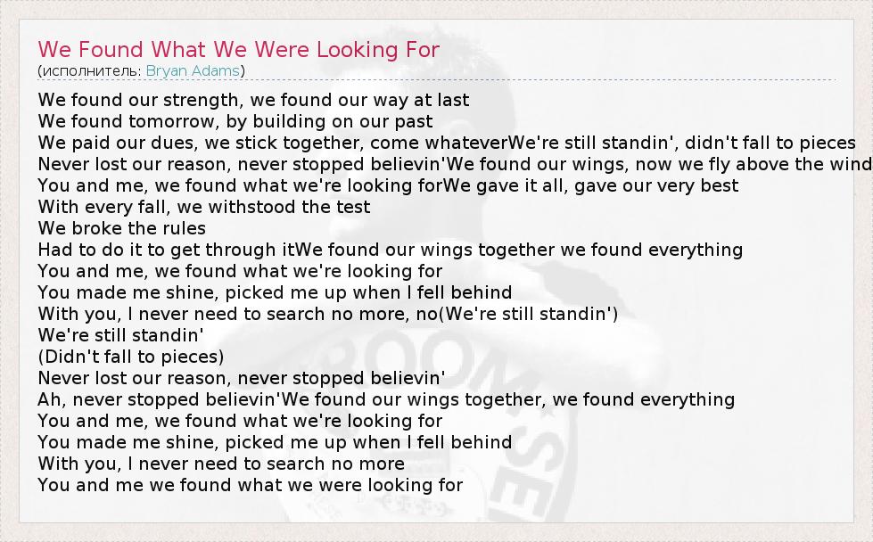 ГлавнаяИсполнителиBryan AdamsWe Found What We Were Looking For