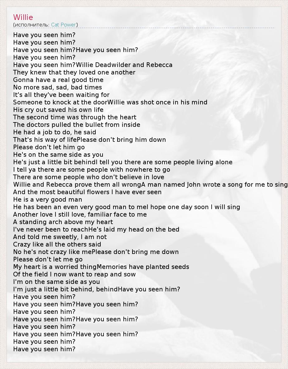 Have you seen him? Have you seen him? Have you seen him?Have you seen him? Have you seen him? Have you seen him?Willie Deadwilder and Rebecca They knew that they loved one another Gonna have a real good time No more sad, sad, bad times It's all they've been waiting for Someone to knock at the doorWillie was shot once in his mind His cry out saved his own life The second time was through the heart The doctors pulled the bullet from inside He had a job to do, he said That's his way of lifePlease don't bring him down Please don't let him go He's on the same side as you He's just a little bit behindI tell you there are some people living alone I tell ya there are some people with nowhere to go There are some people who don't believe in love Willie and Rebecca prove them all wrongA man named John wrote a song for me to sing And the most beautiful flowers I have ever seen He is a very good man He has been an even very good man to meI hope one day soon I will sing Another love I still love, familiar face to me A standing arch above my heart I've never been to reachHe's laid my head on the bed And told me sweetly, I am not Crazy like all the others said No he's not crazy like mePlease don't bring me down Please don't let me go My heart is a worried thingMemories have planted seeds Of the field I now want to reap and sow I'm on the same side as you I'm just a little bit behind, behindHave you seen him? Have you seen him? Have you seen him?Have you seen him? Have you seen him? Have you seen him?Have you seen him? Have you seen him? Have you seen him?Have you seen him? Have you seen him? Have you seen him?