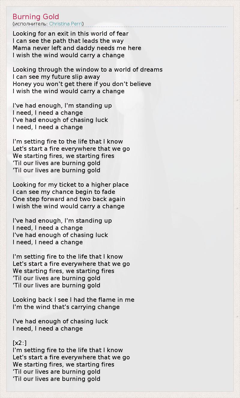 Ищу выход из этого мира страхов, Я вижу тропу, что туда ведёт. Мама никогда не покидала, папе я здесь нужна, Как же хочется, чтобы ветер нёс с собой перемены. Смотрю в окно на мир грёз, Я вижу, как ускользает моё будущее. Милый, без веры ты не попадёшь в тот мир, Как же хочется, чтобы ветер нёс с собой перемены. Я достаточно терпела, я крепко держусь, Мне нужны перемены. Я достаточно пыталась догнать удачу, Мне нужны перемены. Я сжигаю жизнь, которую знаю, Давай оставим огонь везде, где ступаем. Мы наблюдаем за пламенем, Пока наши жизни не засветятся золотом, Пока наши жизни не засветятся золотом. Ища свой билет в счастье, Я вижу, что шансов у меня всё меньше. Один шаг вперёд и два назад, Как же хочется, чтобы ветер нёс с собой перемены. Я достаточно терпела, я крепко держусь, Мне нужны перемены. Я достаточно пыталась догнать удачу, Мне нужны перемены. Я сжигаю жизнь, которую знаю, Давай оставим огонь везде, где ступаем. Мы наблюдаем за пламенем, Пока наши жизни не засветятся золотом, Пока наши жизни не засветятся золотом. Оборачиваясь назад, я вижу, что пламя было во мне, Я и есть тот ветер, что несёт перемены. Я достаточно пыталась догнать удачу, Мне нужны перемены. [x2:] Я сжигаю жизнь, которую знаю, Давай оставим огонь везде, где ступаем. Мы наблюдаем за пламенем, Пока наши жизни не засветятся золотом, Пока наши жизни не засветятся золотом.