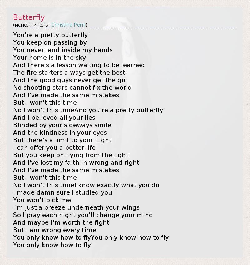You're a pretty butterfly You keep on passing by You never land inside my hands Your home is in the sky And there's a lesson waiting to be learned The fire starters always get the best And the good guys never get the girl No shooting stars cannot fix the world And I've made the same mistakes But I won't this time No I won't this timeAnd you're a pretty butterfly And I believed all your lies Blinded by your sideways smile And the kindness in your eyes But there's a limit to your flight I can offer you a better life But you keep on flying from the light And I've lost my faith in wrong and right And I've made the same mistakes But I won't this time No I won't this timeI know exactly what you do I made damn sure I studied you You won't pick me I'm just a breeze underneath your wings So I pray each night you'll change your mind And maybe I'm worth the fight But I am wrong every time You only know how to flyYou only know how to fly You only know how to fly
