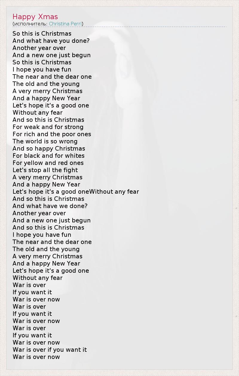 So this is Christmas And what have you done? Another year over And a new one just begun So this is Christmas I hope you have fun The near and the dear one The old and the young A very merry Christmas And a happy New Year Let's hope it's a good one Without any fear And so this is Christmas For weak and for strong For rich and the poor ones The world is so wrong And so happy Christmas For black and for whites For yellow and red ones Let's stop all the fight A very merry Christmas And a happy New Year Let's hope it's a good oneWithout any fear And so this is Christmas And what have we done? Another year over And a new one just begun And so this is Christmas I hope you have fun The near and the dear one The old and the young A very merry Christmas And a happy New Year Let's hope it's a good one Without any fear War is over If you want it War is over now War is over If you want it War is over now War is over If you want it War is over now War is over if you want it War is over now
