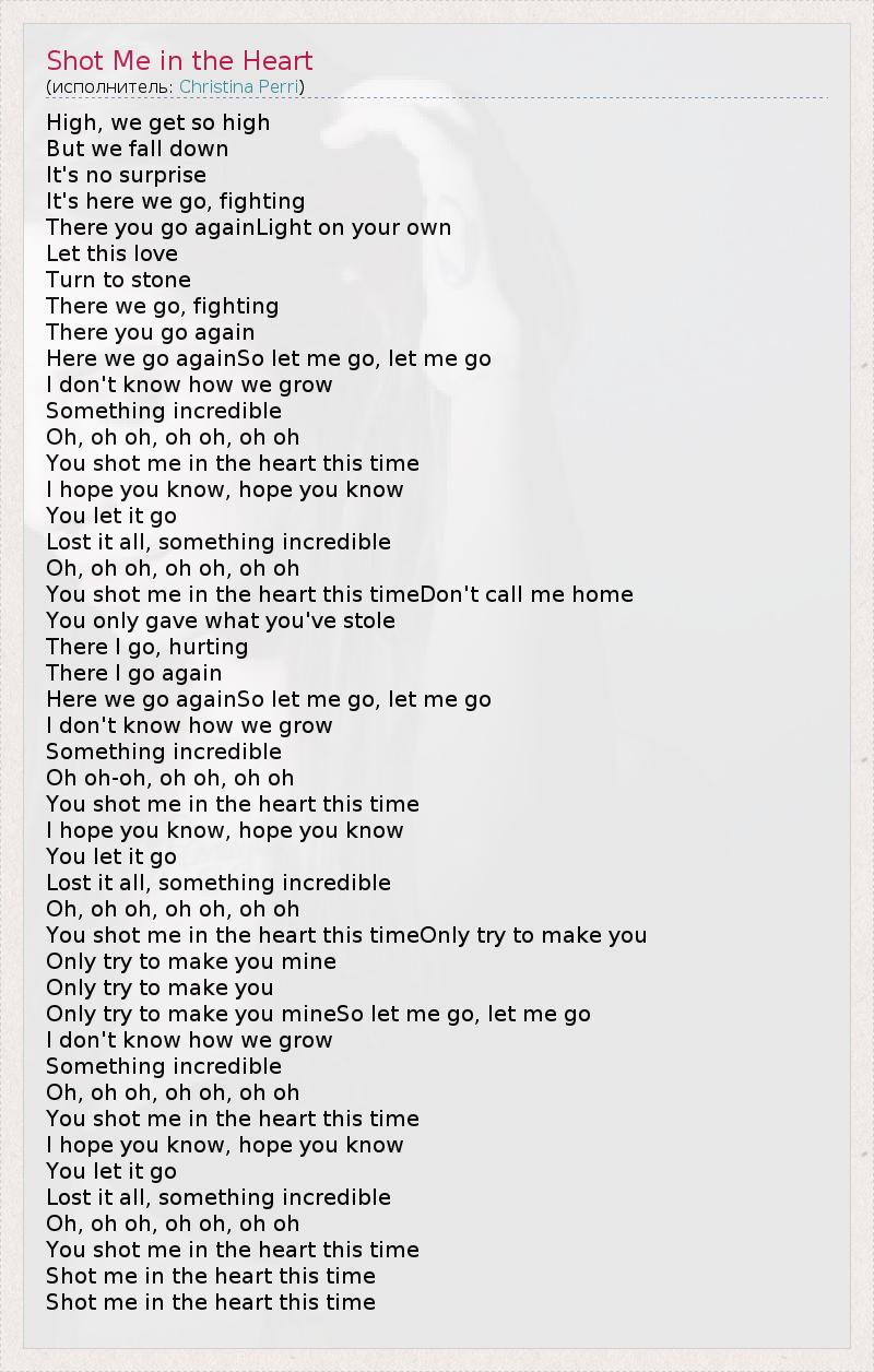 High, we get so high But we fall down It's no surprise It's here we go, fighting There you go againLight on your own Let this love Turn to stone There we go, fighting There you go again Here we go againSo let me go, let me go I don't know how we grow Something incredible Oh, oh oh, oh oh, oh oh You shot me in the heart this time I hope you know, hope you know You let it go Lost it all, something incredible Oh, oh oh, oh oh, oh oh You shot me in the heart this timeDon't call me home You only gave what you've stole There I go, hurting There I go again Here we go againSo let me go, let me go I don't know how we grow Something incredible Oh oh-oh, oh oh, oh oh You shot me in the heart this time I hope you know, hope you know You let it go Lost it all, something incredible Oh, oh oh, oh oh, oh oh You shot me in the heart this timeOnly try to make you Only try to make you mine Only try to make you Only try to make you mineSo let me go, let me go I don't know how we grow Something incredible Oh, oh oh, oh oh, oh oh You shot me in the heart this time I hope you know, hope you know You let it go Lost it all, something incredible Oh, oh oh, oh oh, oh oh You shot me in the heart this time Shot me in the heart this time Shot me in the heart this time