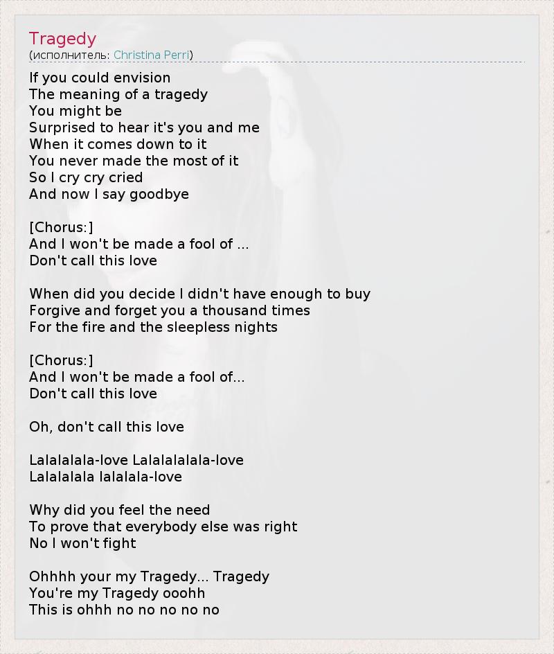 Если бы ты мог представить себе Значение понятия "трагедия", Ты был бы Удивлён, услышав, что это - ты и я. Если в этом разобраться, То ты никогда не старался по максимуму, Поэтому я только и делала, что плакала, А теперь я говорю "Прощай". [Припев:] Я не позволю делать из себя дуру... Не называй это любовью. Когда ты смог определить, что я уже не способна вестись, В тысячный раз прощать и забывать твои проколы Ради страсти и бессонных ночей? [Припев:] Я не позволю делать из себя дуру... Не называй это любовью. О, не называй это любовью, Ла-ла-ла-любовью, ла-ла-ла-любовью, Ла-ла-ла, ла-ла-ла-любовью. Почему ты почувствовал потребность Доказать, что все остальные были правы? Нет, я не буду бороться. О, ты - моя трагедия... Трагедия! Ты - моя трагедия, о, Это... О, нет, нет, нет, нет, нет...